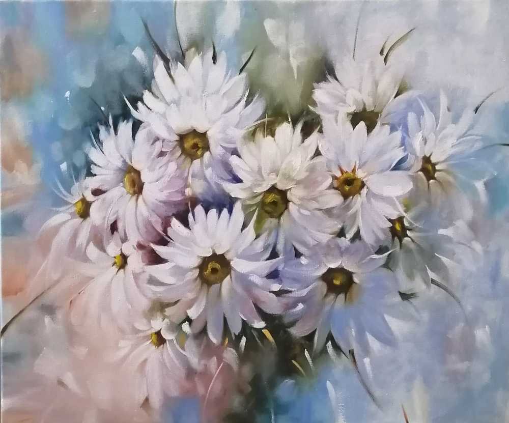 Светлая и воздушная картина с букетом ромашек наполнена атмосферой лета и природной гармонии. Белые лепестки цветов мягко переливаются на нежном пастельном фоне, создавая ощущение лёгкости и свежести.