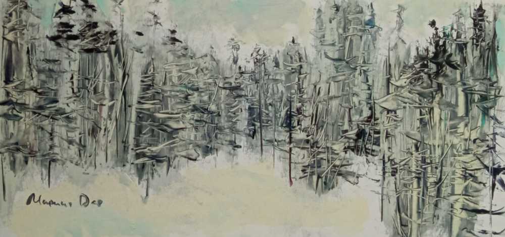 Картина «Пасмурный день» передаёт атмосферу тихого зимнего леса, укутанного мягким светом облачного неба.