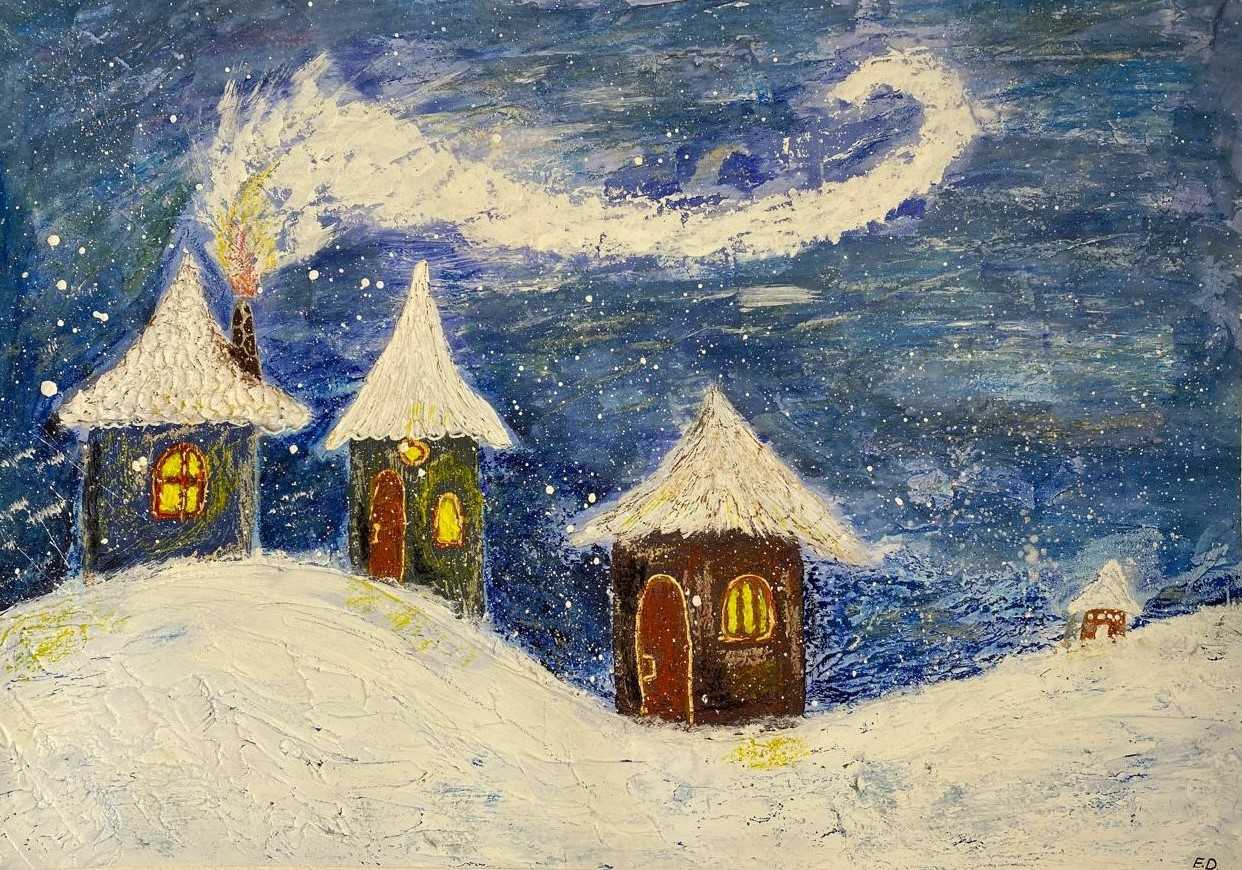Эта зимняя работа наполнена ощущением тишины, уюта и маленького чуда. На фоне глубокого синего неба стоят три домика, укрытые пушистыми снежными крышами. Из трубы одного из них поднимается тёплый дым, растворяясь в морозном воздухе, а свет из окон напоминает о тепле, которое мы храним внутри даже в