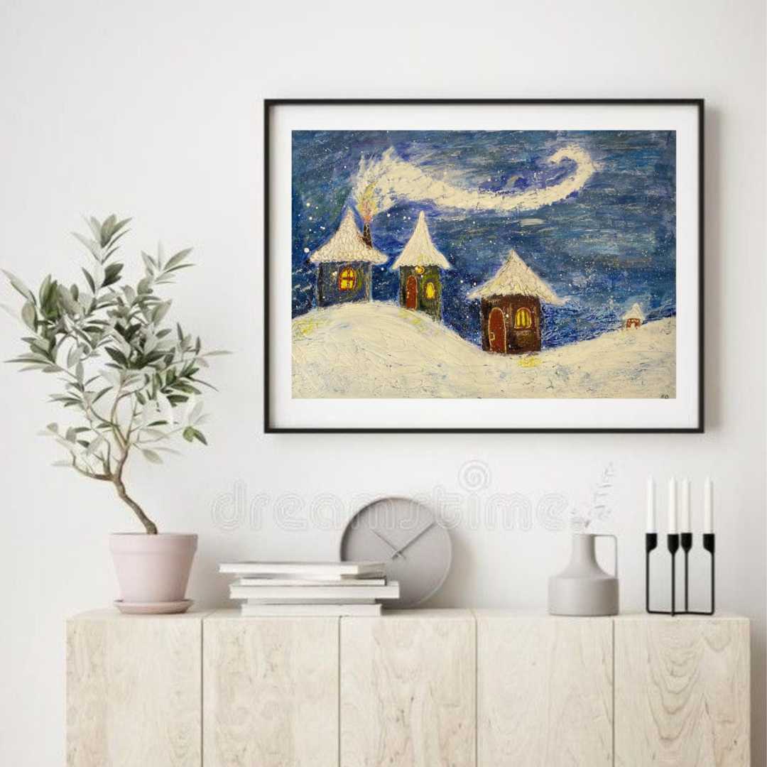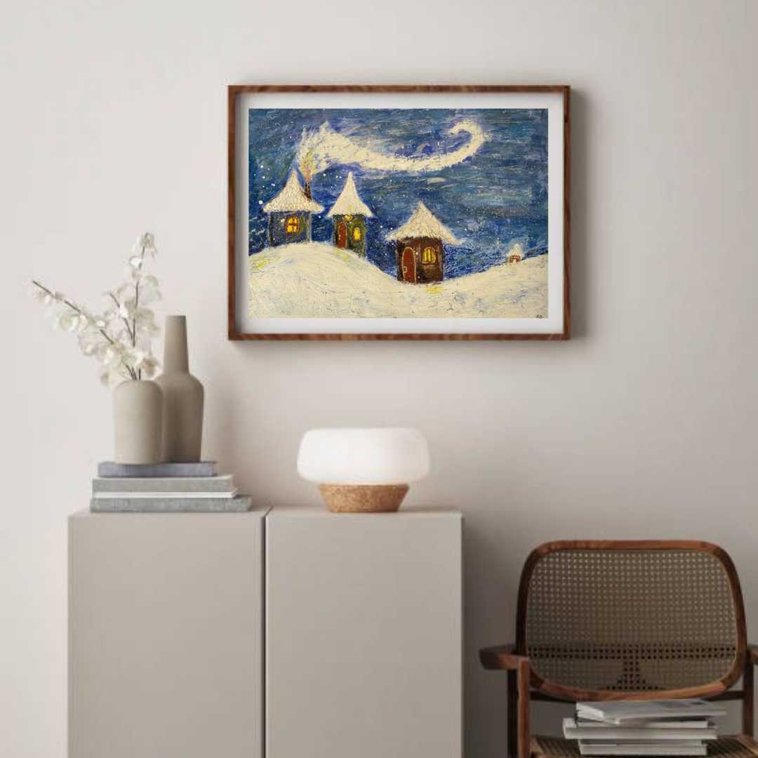 Текстурный снег, мерцание пастели и акриловые мазки создают живую атмосферу зимней ночи, когда каждая снежинка будто светится. Картина напоминает о покое, домашнем тепле и тихой зимней магии, которая окружает нас в самые простые моменты.