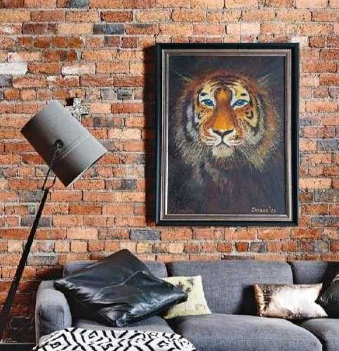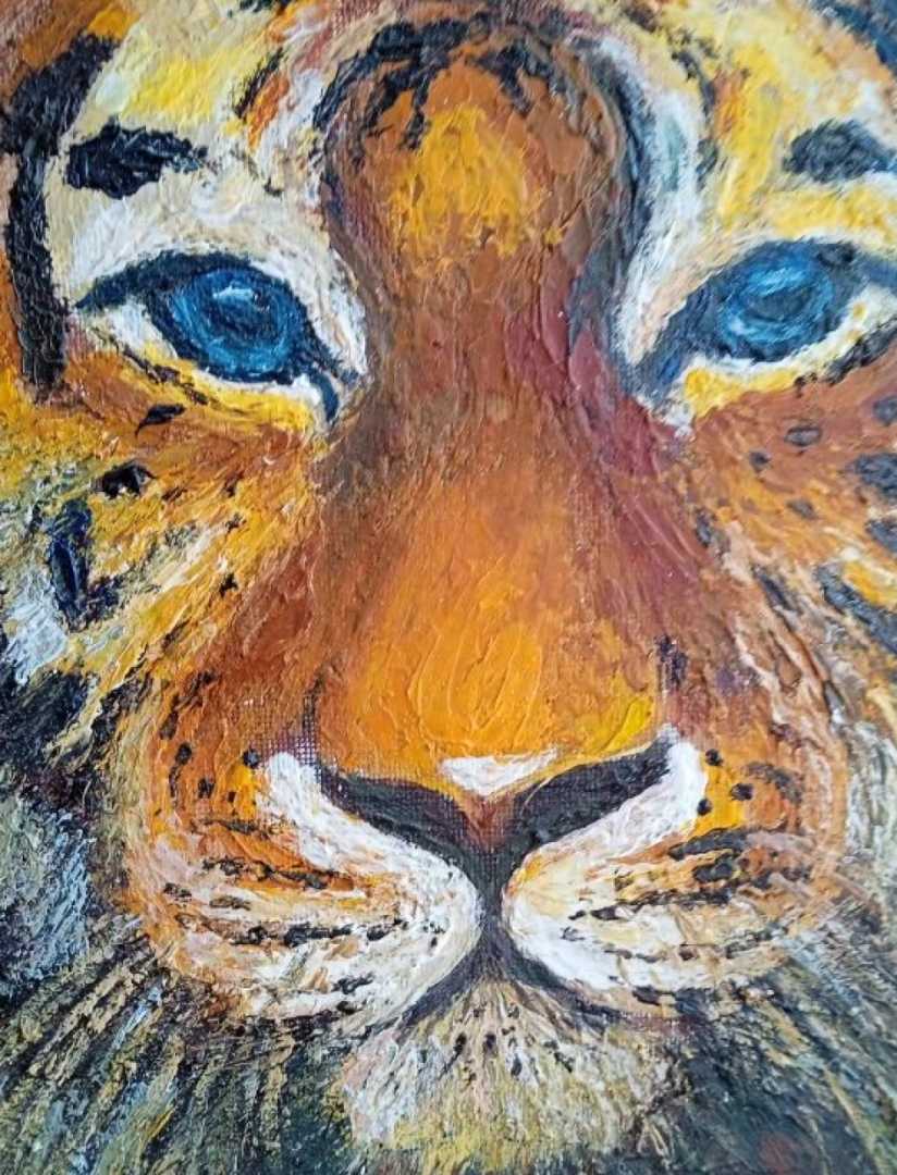 Картина отражает силу и выразительность тигра через детальное изображение его головы. Особое внимание уделено глазам, полным живости и глубины, которые создают ощущение прямого взгляда животного.