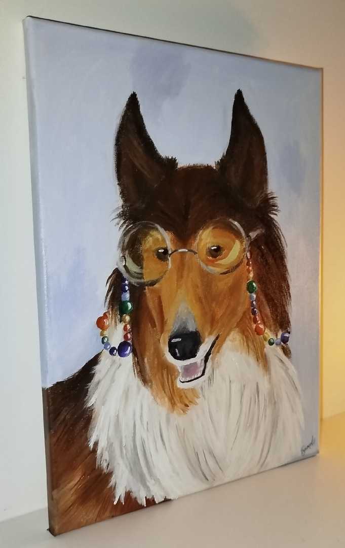Здесь изображён прекрасный колли в круглых цветных очках и разноцветной цепочкой на них.