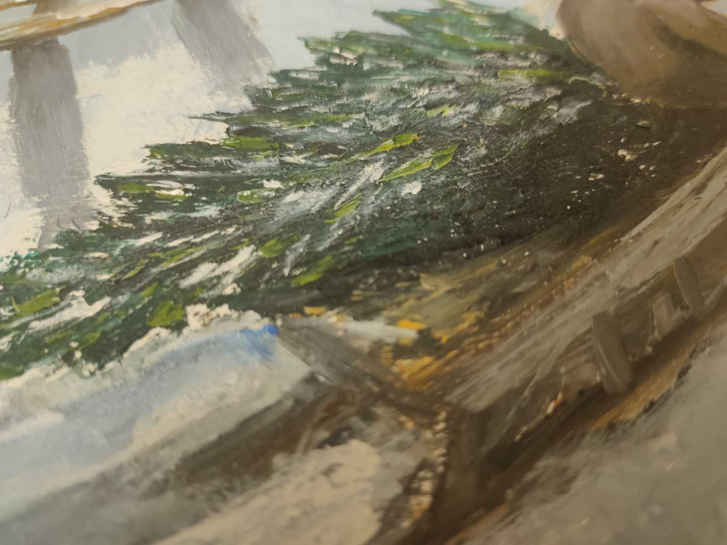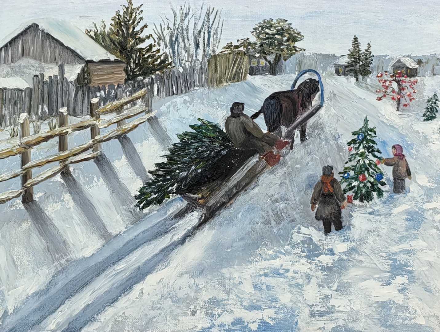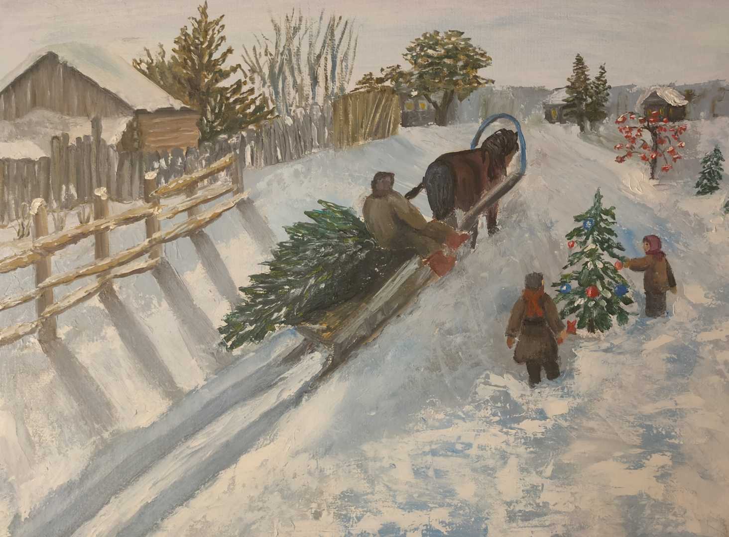 На картине изображен зимней день, предновогодняя суета в деревне. День холодный и солнечный. Царит праздничное настроение. Пахнет свежесрубленной ёлкой, которую везёт мужик на санях, и слышна беседа детишек. Аккуратно, ч