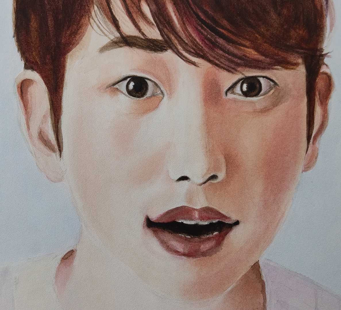Этот акварельный портрет изображает молодого азиатского мужчину, запечатлённого в момент искреннего удивления. Широко раскрытые глаза и слегка приоткрытые губы передают спонтанность, любопытство и эмоциональную открытость.