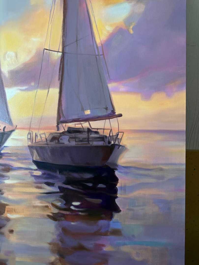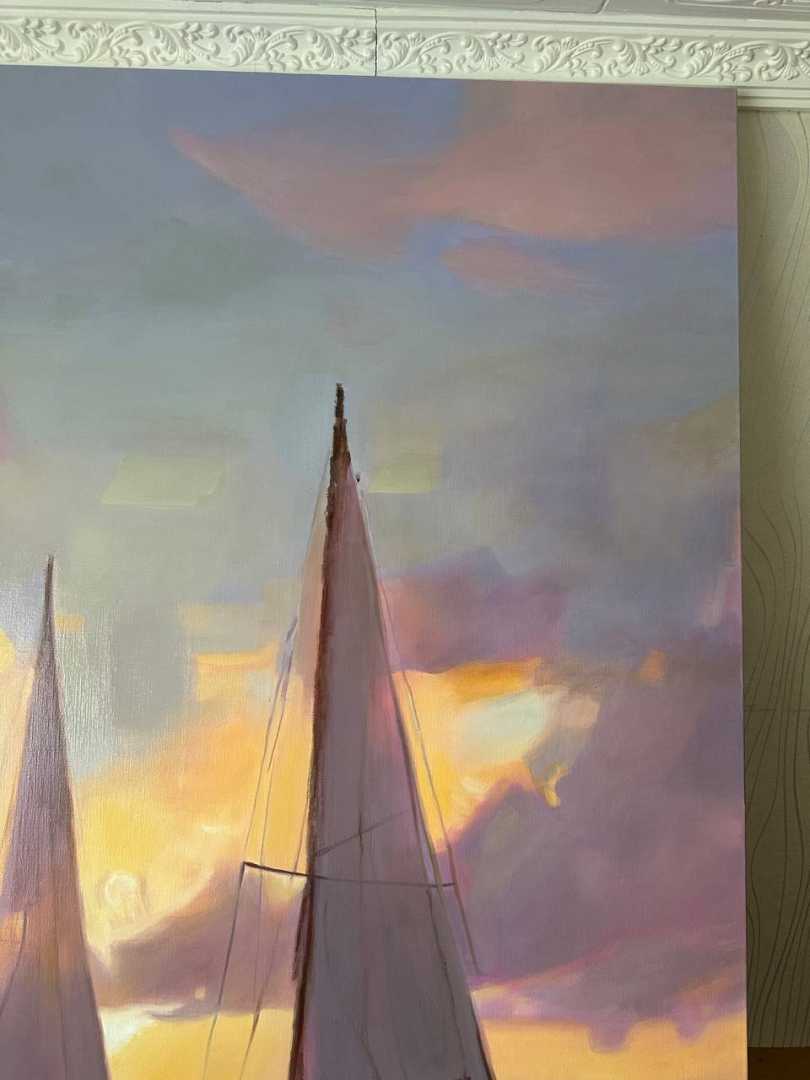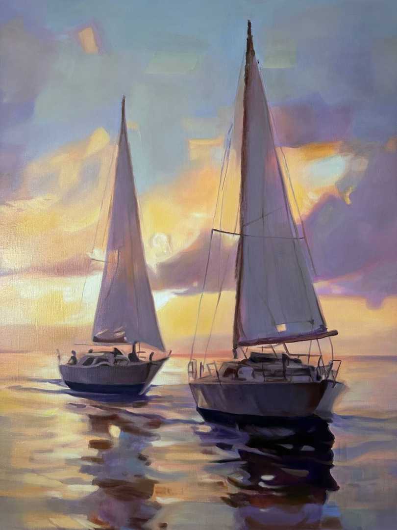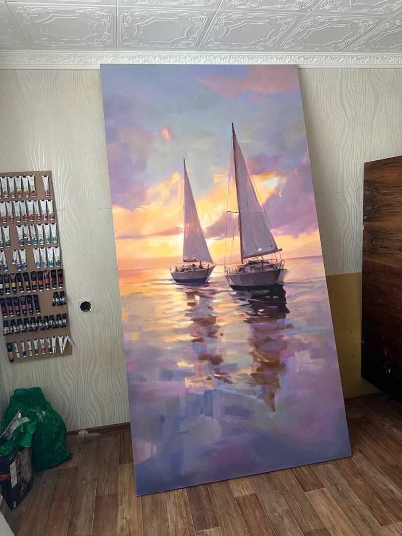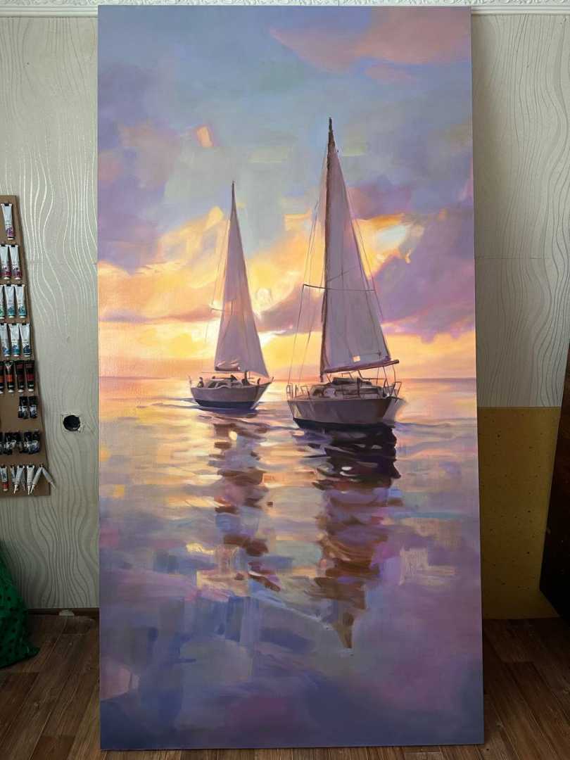 Это история о тишине и надеждах, рассказанная через два маленьких кораблика, плывущих по спокойным волнам в золотистом сиянии заходящего солнца. Картина передаёт нежную атмосферу уединения и гармонии, когда вечернее небо окутывает всё вокруг мягк