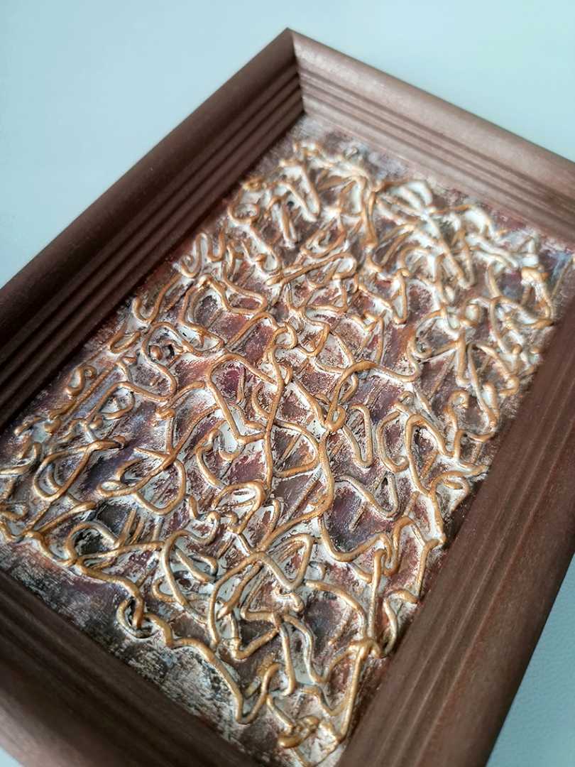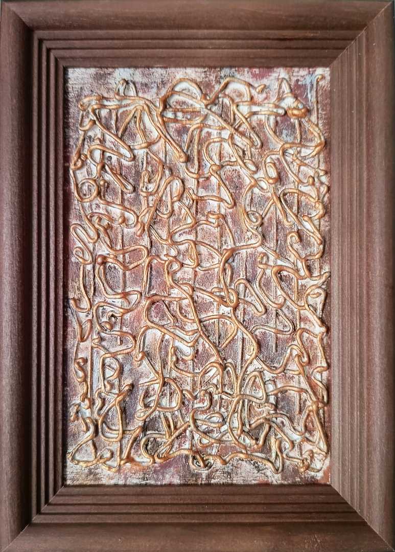 Картина выполнена в смешанной технике, имеет фактуру и объем. Оформлена в деревянную рамку с подставкой. Размер без рамки – 10х1