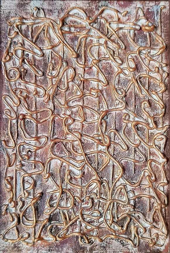 Картина представляет собой абстрактную композицию с объемными переплетающимися линиями, которые символизируют поток событий и связь между прошлым и настоящим.