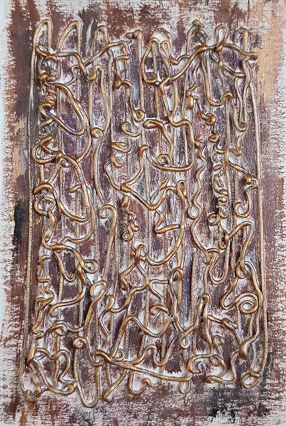 Картина представляет собой абстрактную композицию с объемными переплетающимися линиями, которые символизируют поток событий и связь между прошлым и настоящим.