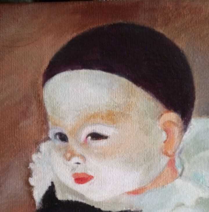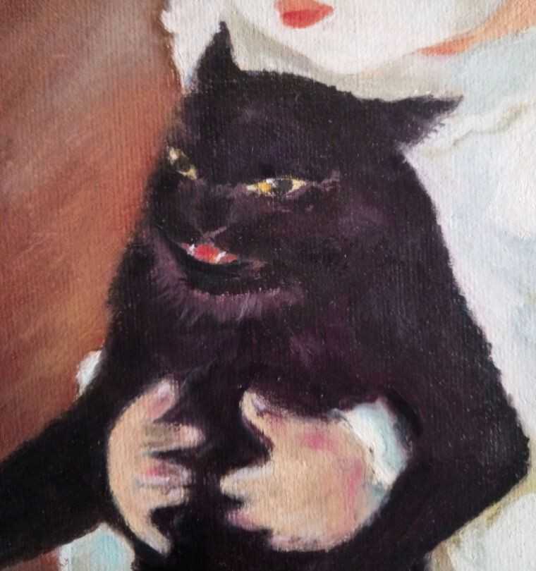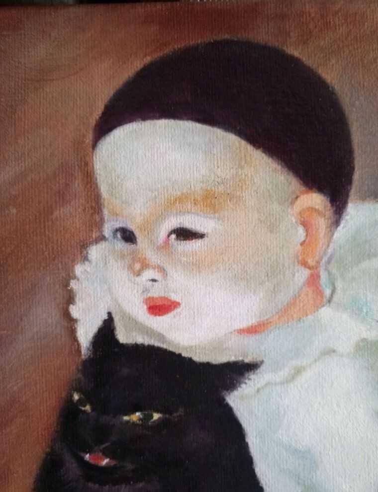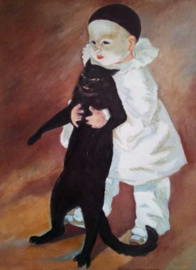 Эмоциональная авторская картина в стиле модерн, изображающая маленького Пьеро с чёрным котом. Контраст светлого костюма и густого тёмного силуэта создаёт особое напряжение и поэтичность сцены. Работа наполнена символикой — детская чистота, одиночество и мистическая привязанность к животному. Подойдё