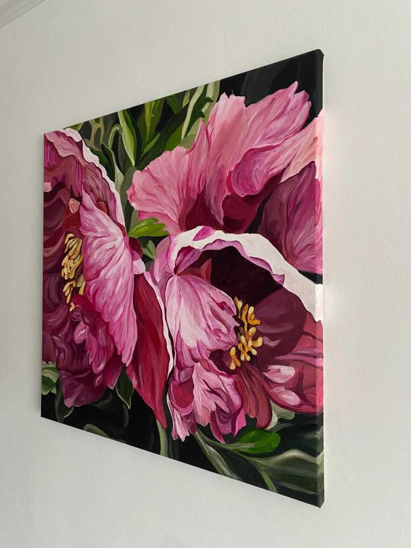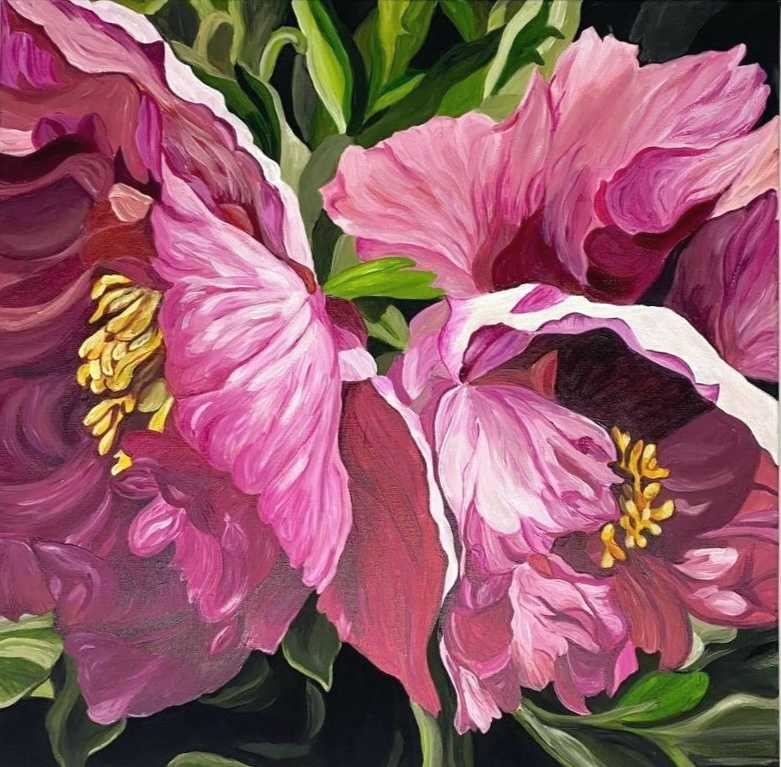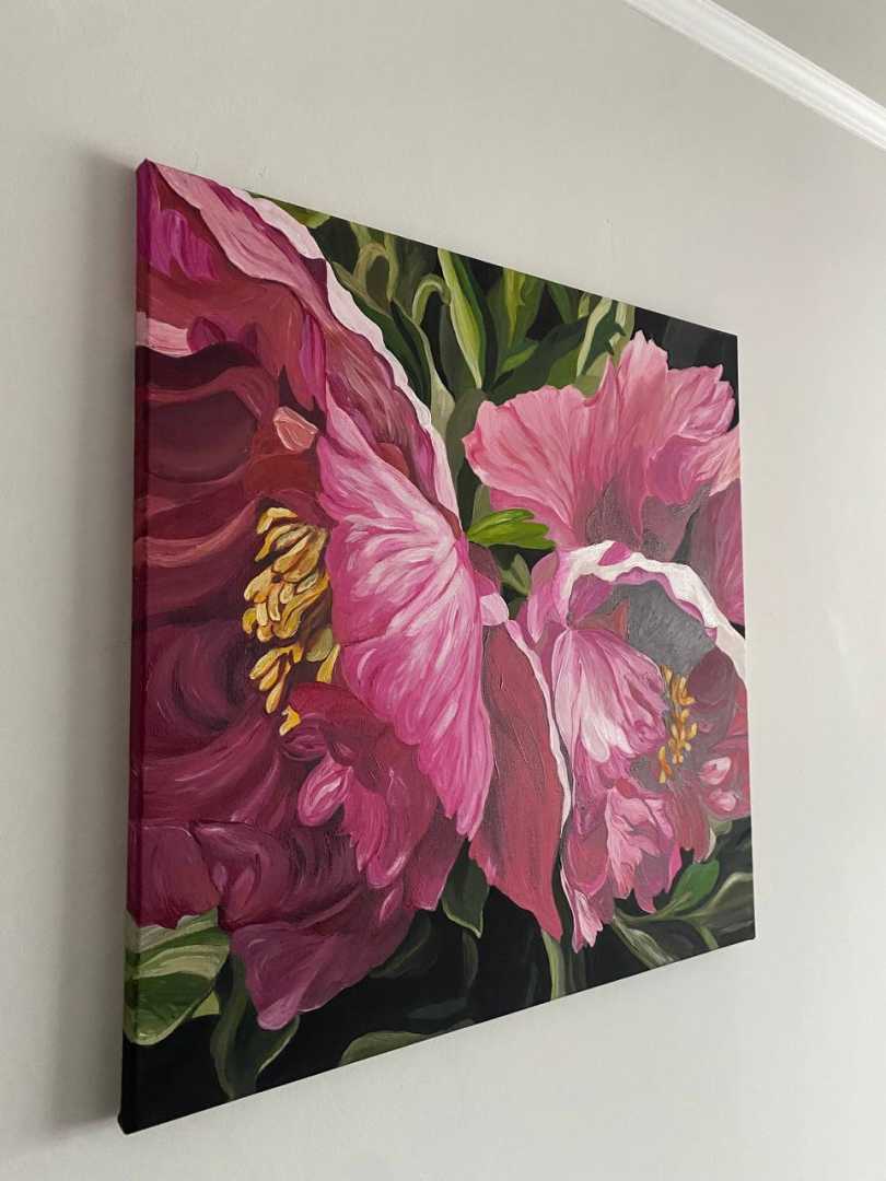 Роскошь, застывшая в краске. Глубокий бордово-розовый пион с золотистым центром — как драгоценность, вырванная из летнего сада. Контраст с тёмным фоном и свежей зеленью подчеркивает его объём, шелковистость и внутреннюю силу.