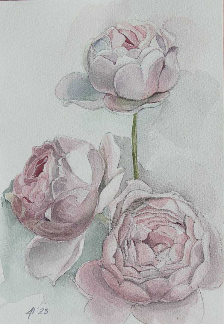 Лёгкая и утончённая акварель с изображением трёх пионов в пастельной розово-пудровой гамме. Прозрачные слои краски и мягкие переходы оттенков создают ощущение воздушности и хрупкой красоты.