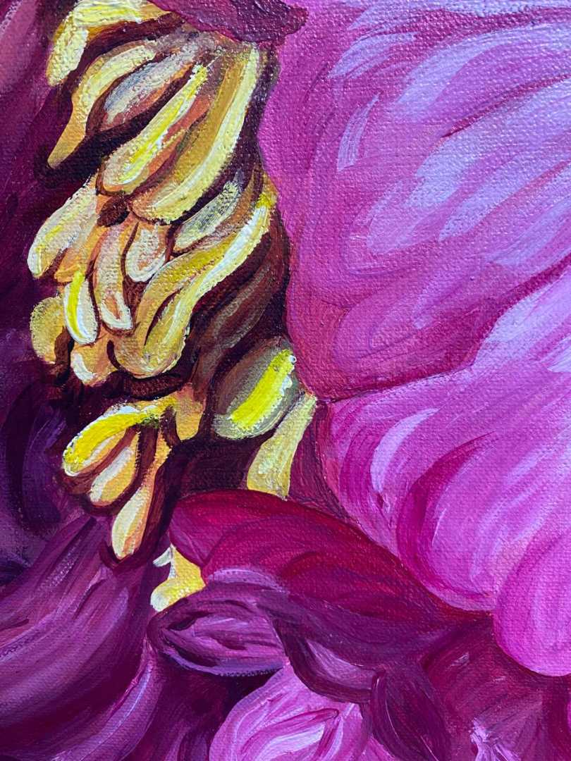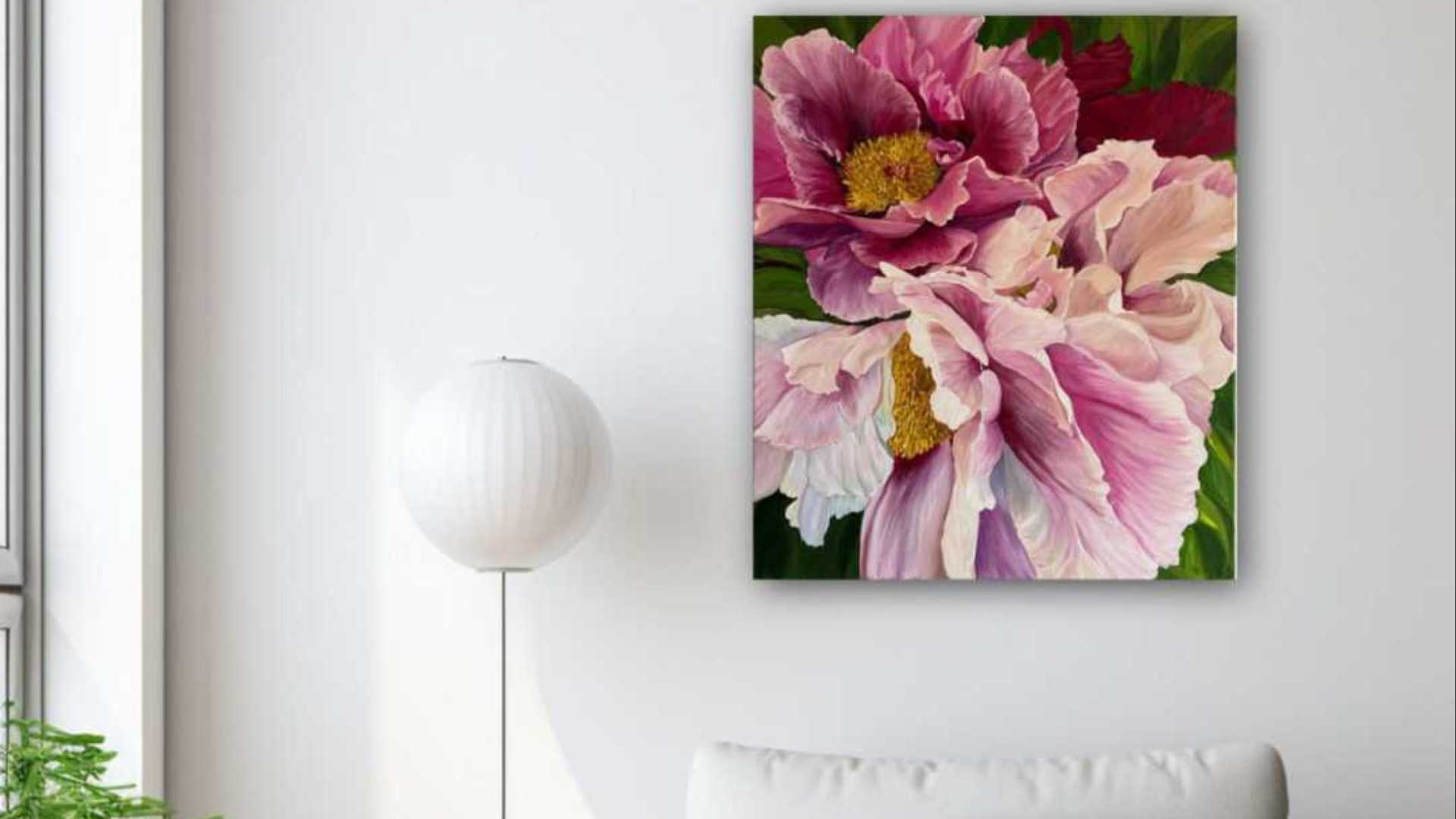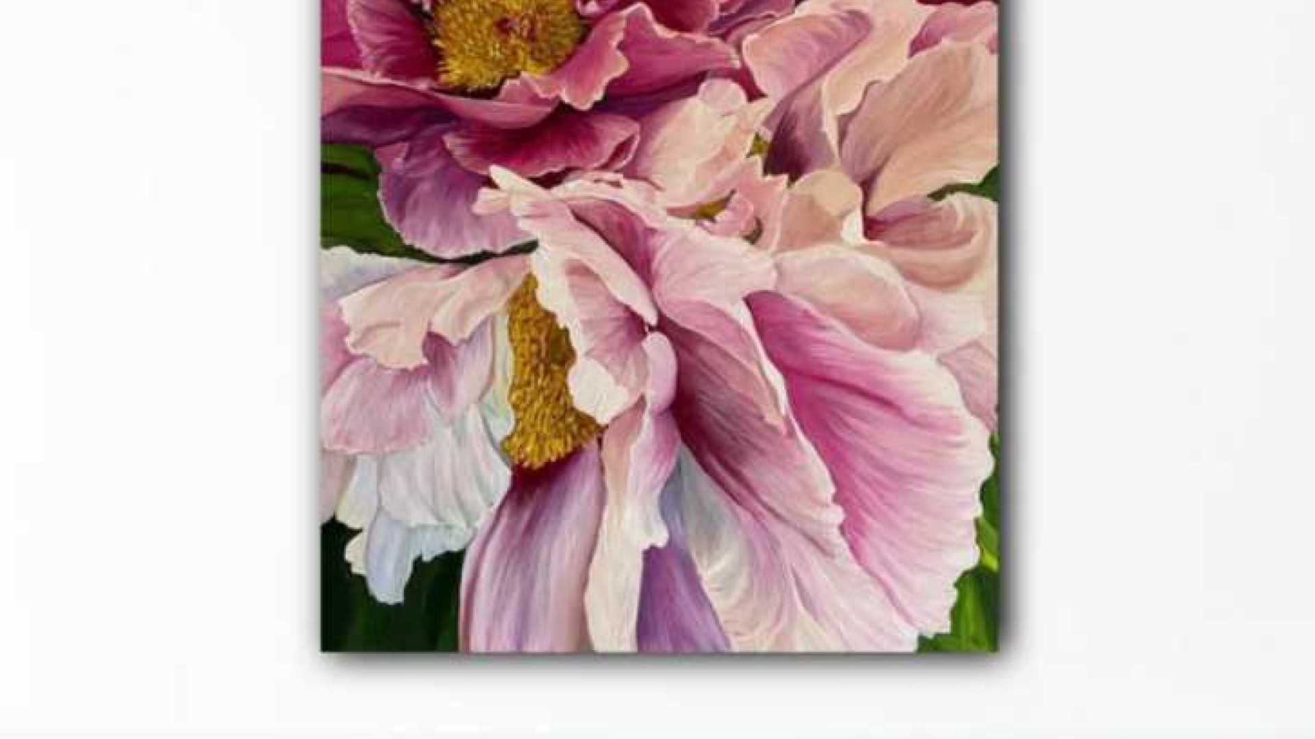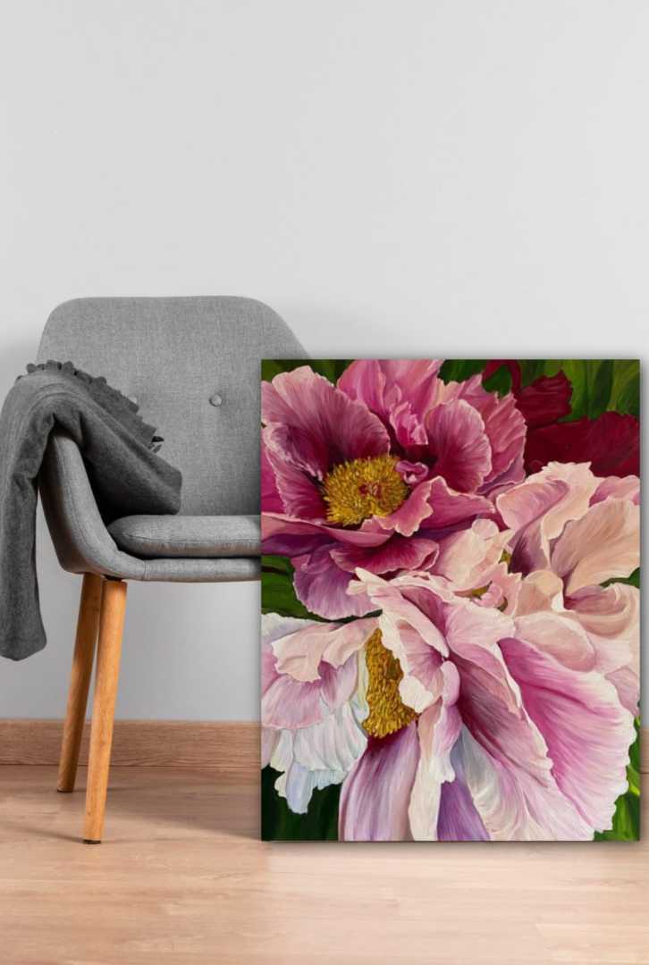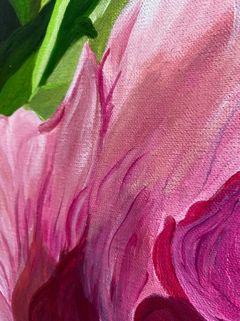 Два пиона — один яркий, как закат, другой нежный, как рассвет. Глубокий бордово-розовый и светло-персиковый цветы сливаются в единый танец, подчеркнутый зеленью листьев и золотом тычинок. Акриловая живопись передаёт шелковистость лепестков и