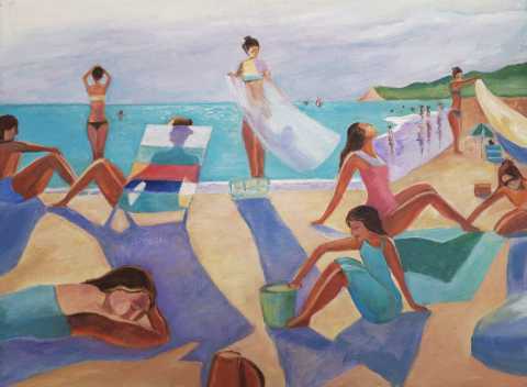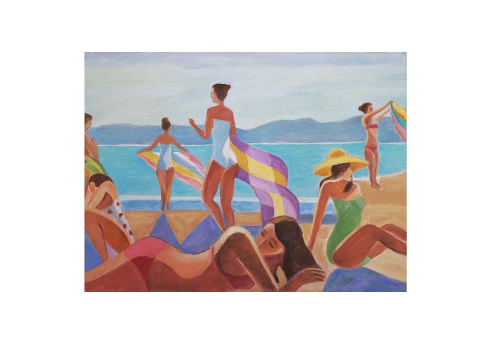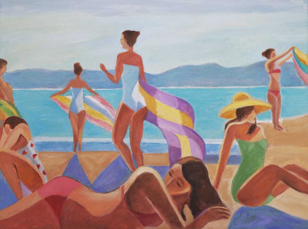 Живописная картина с девушками на пляже у моря, передающая атмосферу лета, отдыха и тёплого солнечного дня. Лёгкие фигуры, яркие купальники и морской пейзаж создают ощущение свободы и беззаботности.