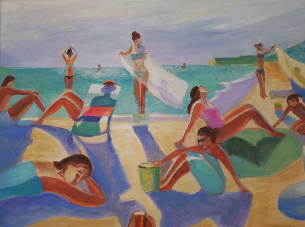 летнего дня у моря. Фигуры отдыхающих, расстеленные полотенца,