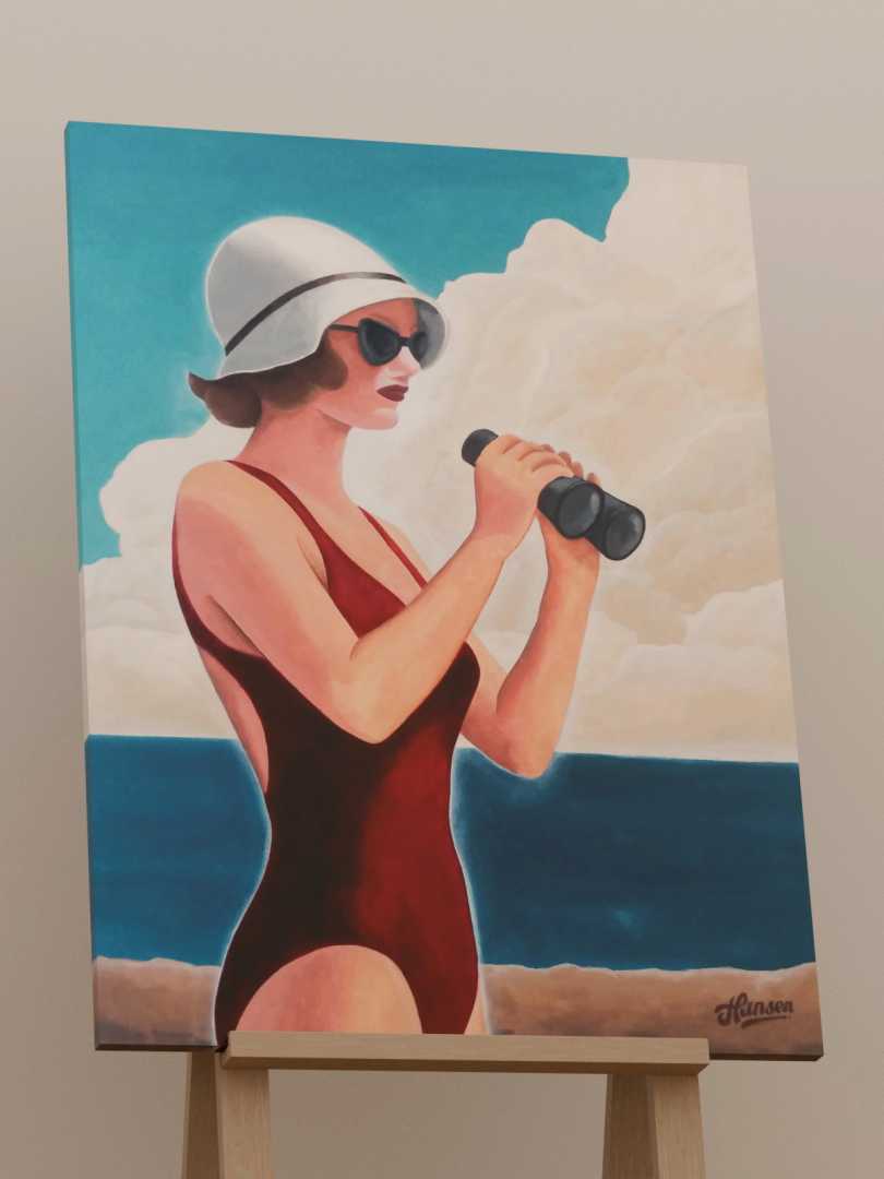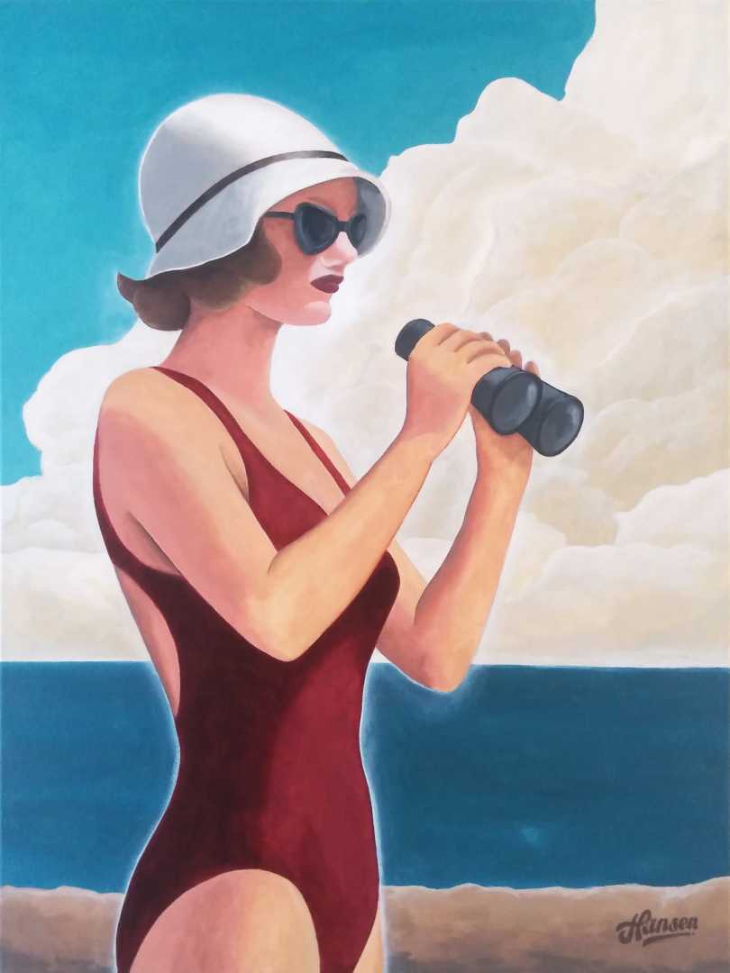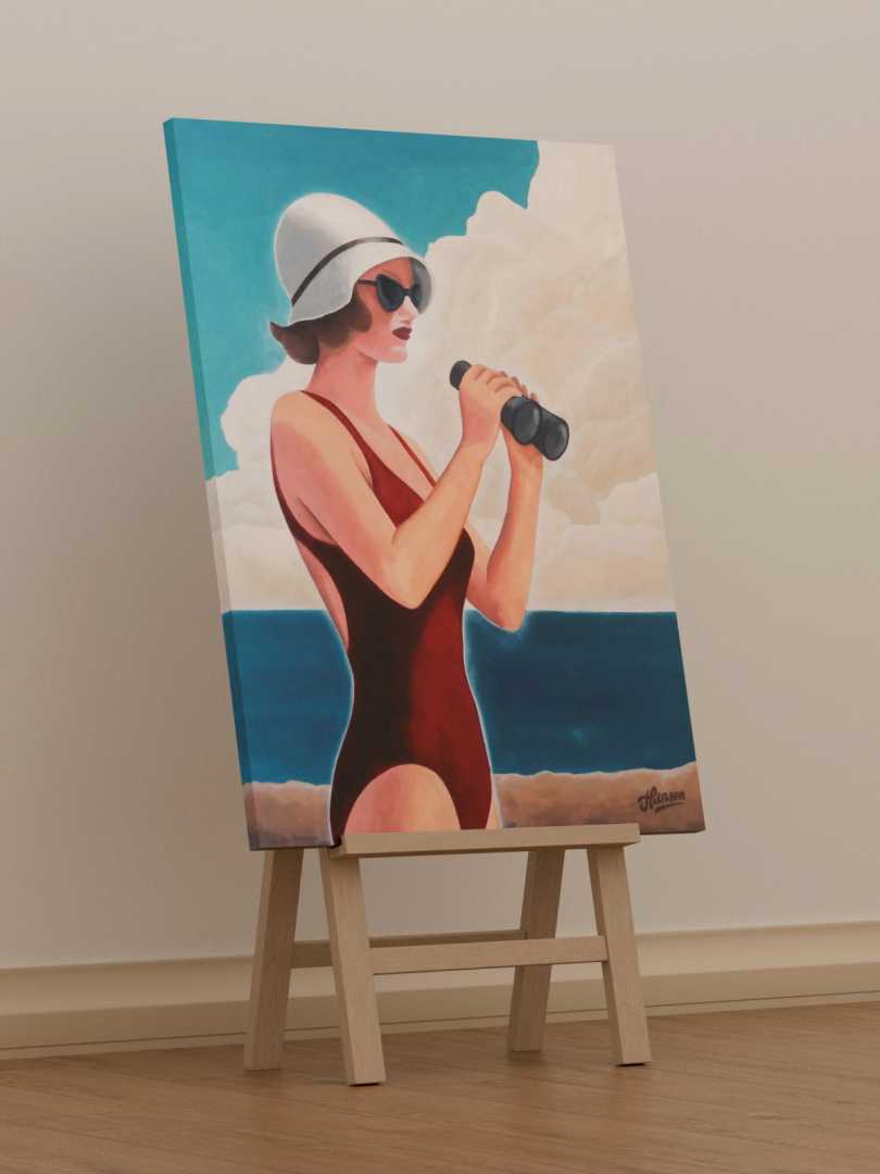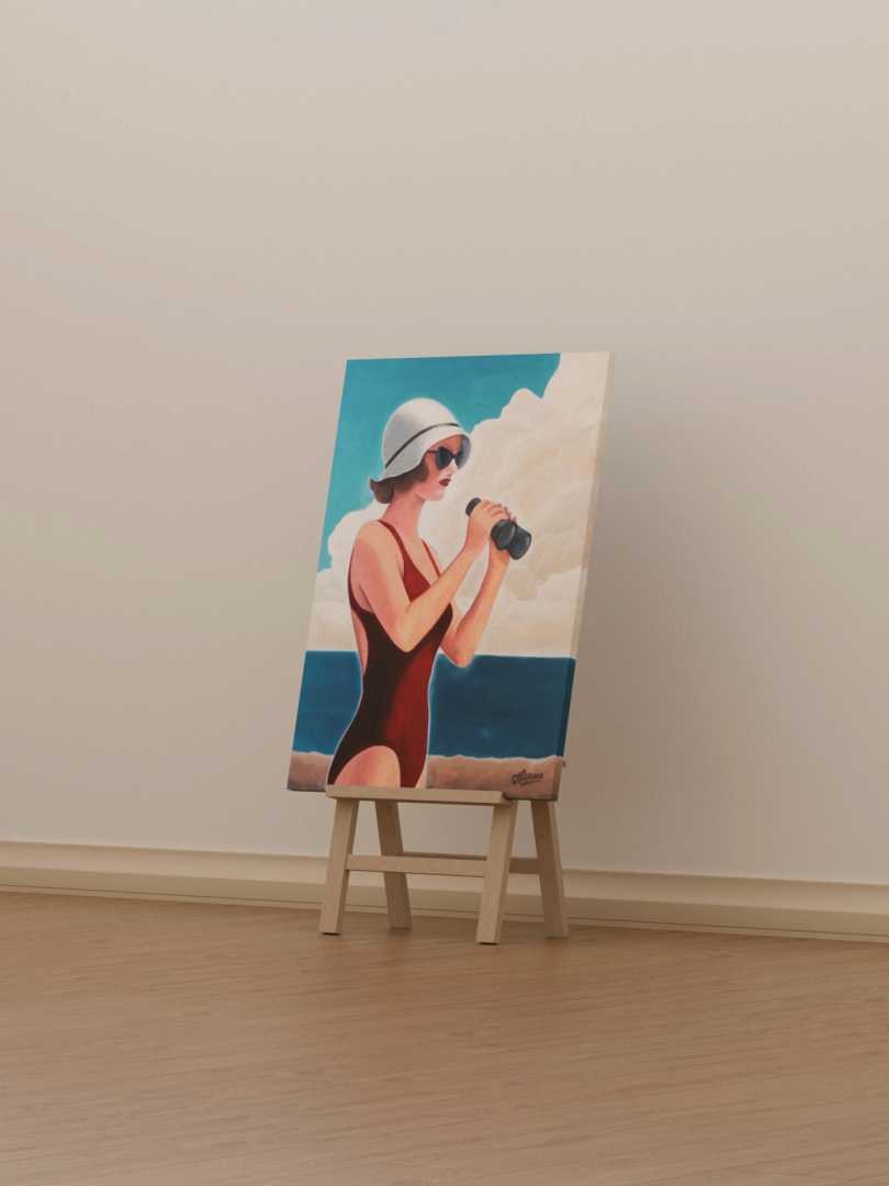 Женщина у моря смотрит в бинокль не столько вдаль, сколько «чуть дальше обычного». Будто проверяет горизонт: всё ли спокойно, что там впереди, можно ли выдохнуть.