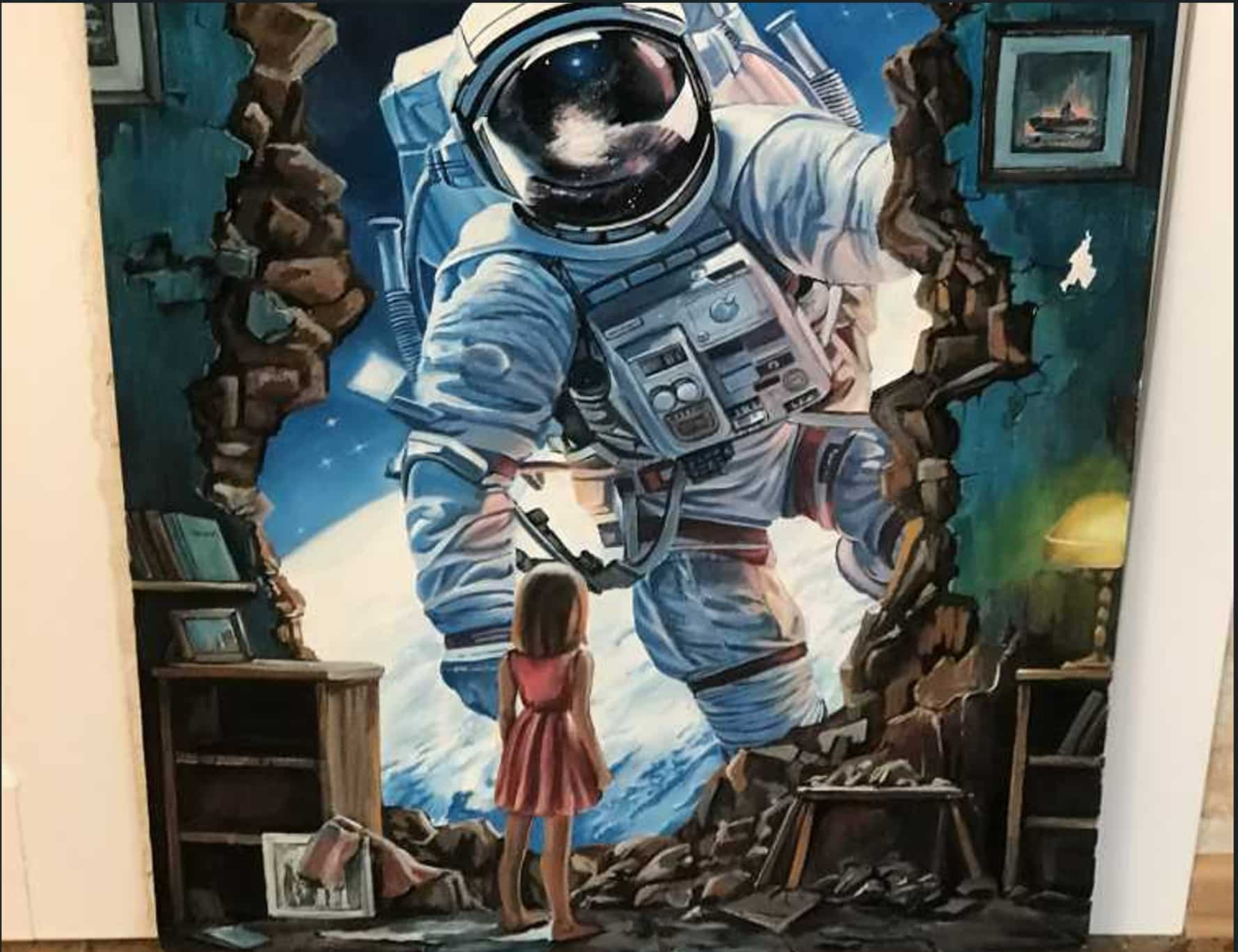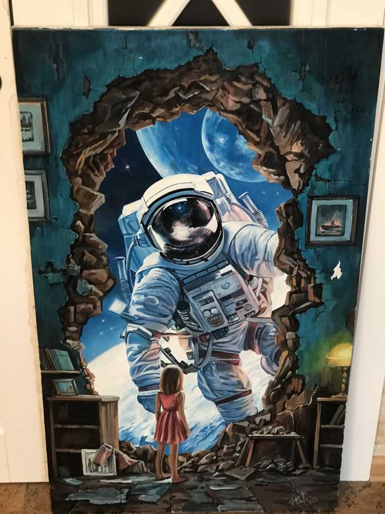 ты, смотрит на астронавта, находящегося в космическом пространстве. Трещины на стенах комнаты создают ощущение, что она вот-вот рухнет, но вместо этого они открывают путь в неизведанное. Астронавт, словно посланник из другого мира, смотрит на девочку, приглашая её в путешествие, полное приключений и открытий. Картина выполнена в тёмных тонах, что усиливает атмосферу таинственности и волшебства. Каждый элемент — от книг и картин на полу до разрушенных стен — добавляет глубину и многослойность изображению. Это не просто картина, это приглашение в мир, где каждый может найти своё место и свою историю. Эта работа станет идеальным дополнением для любого интерьера, добавляя в него нотку загадочности и вдохновения. Она будет вдохновлять вас каждый день, напоминая о том, что мечты могут стать реальностью, если только мы позволим себе поверить в них.