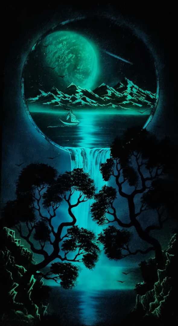 Холст 60х110 см., аэрозольными акриловыми красками без использования кисти, светится в темноте.