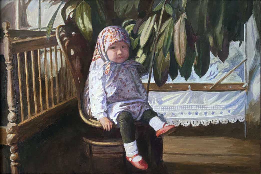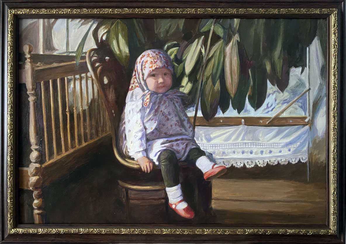 Этот портрет выполнен акриловыми красками на холсте по старой чёрно - белой фотографии из семейного альбома клиента. Цветовая гамма выбрана так, чтобы сохранить ощущение старого времени.