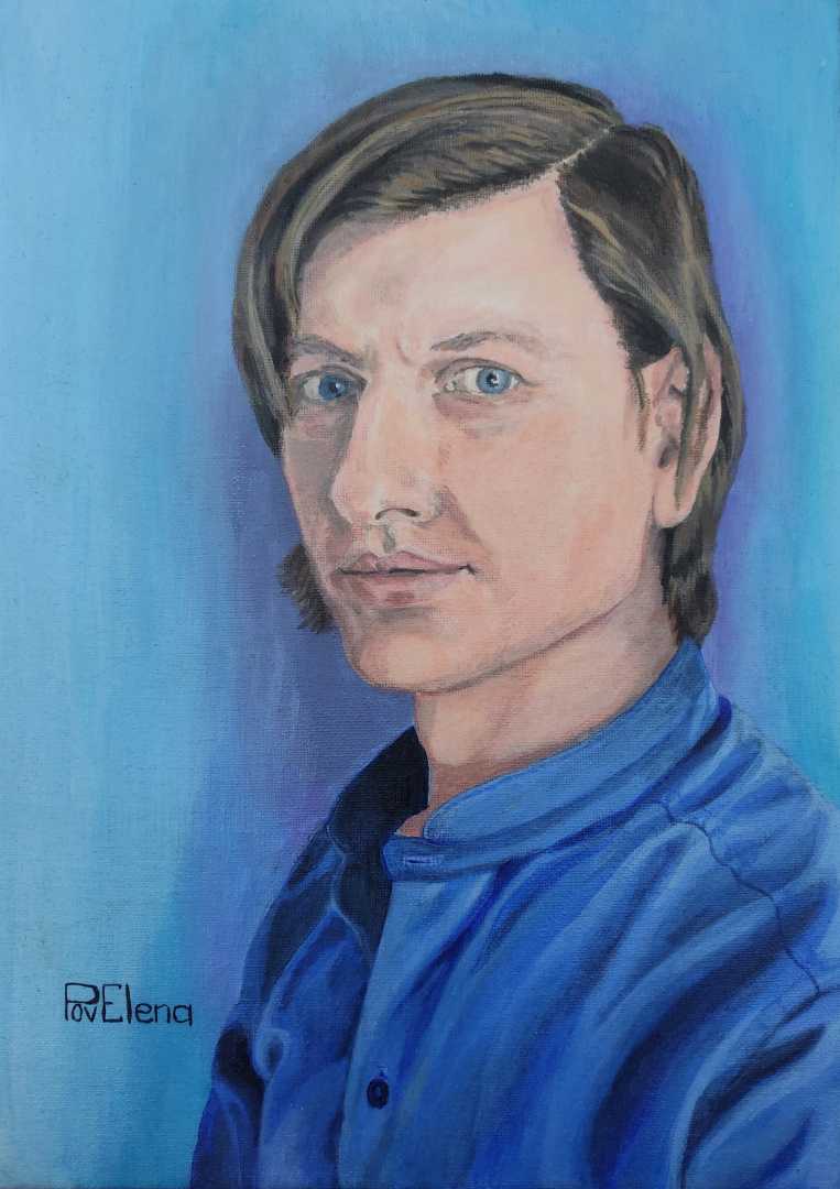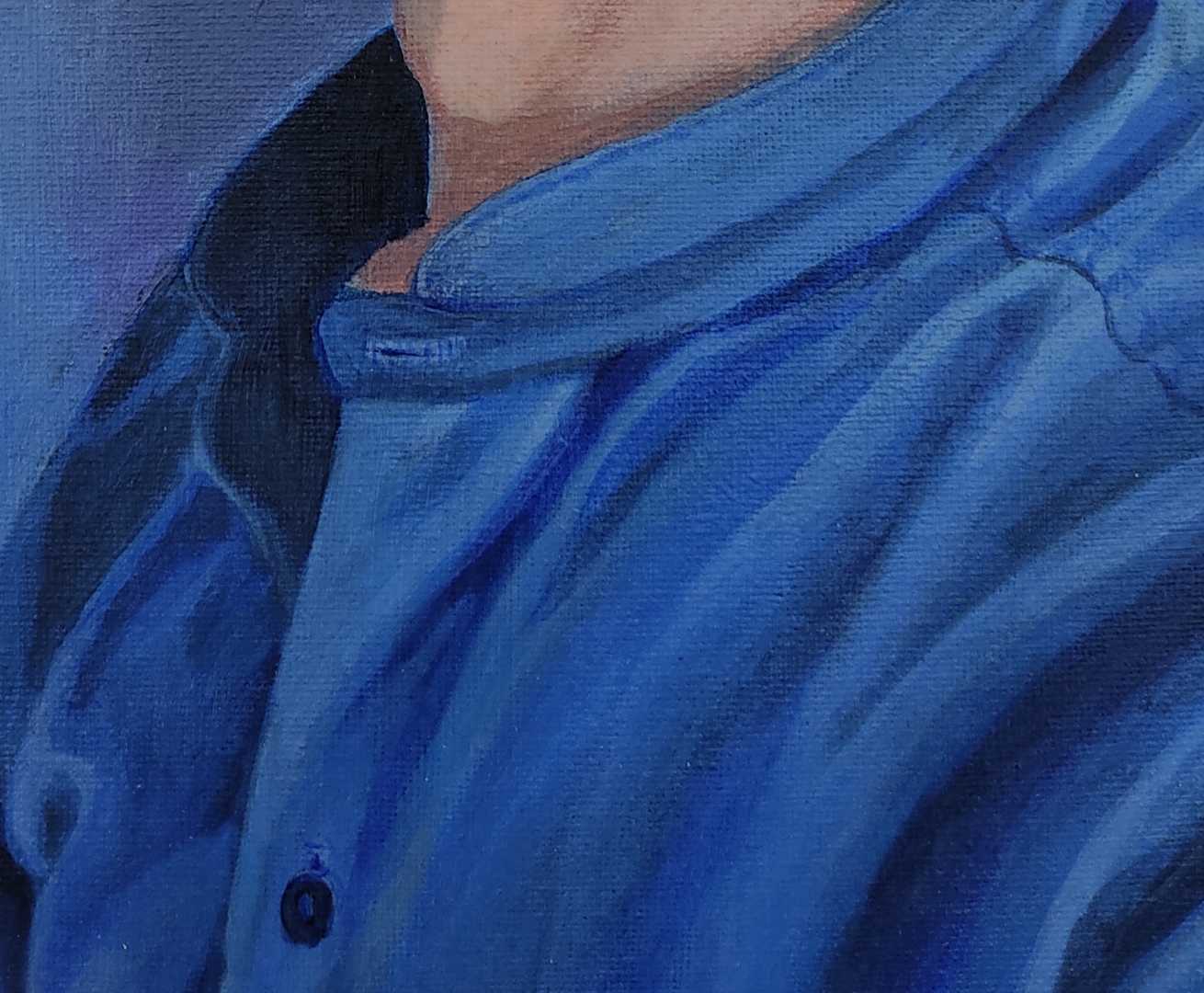 Художник использует богатую палитру синих оттенков — от глубокого цвета рубашки до более мягких, атмосферных тонов фона. Этот прием погружает геро