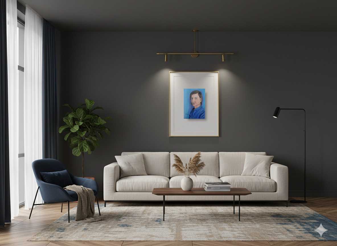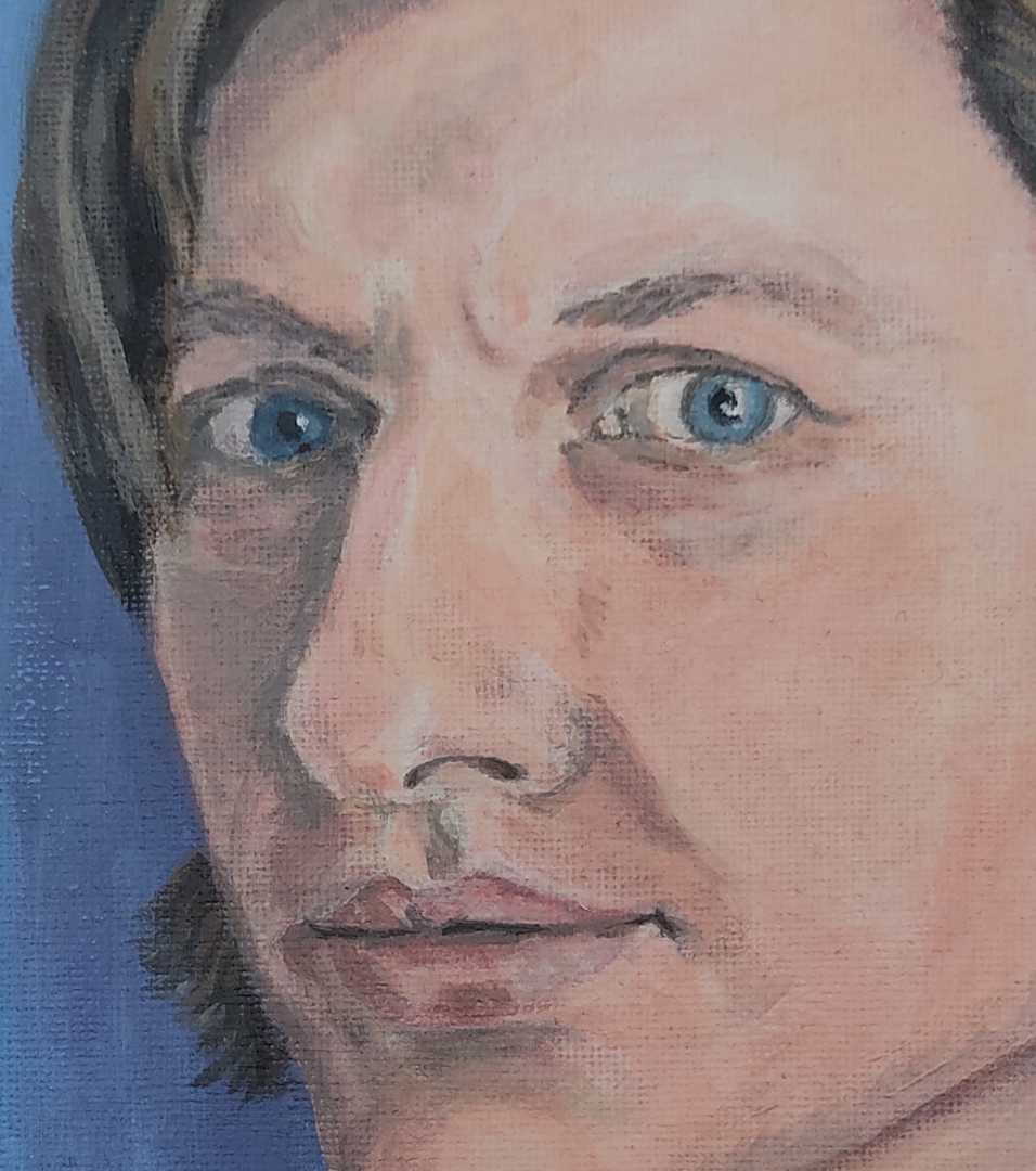 Прямой, пронзительный взгляд голубых глаз встречается с вашим и удерживает его, создавая мощный, безмолвный диалог между зрителем и холстом.