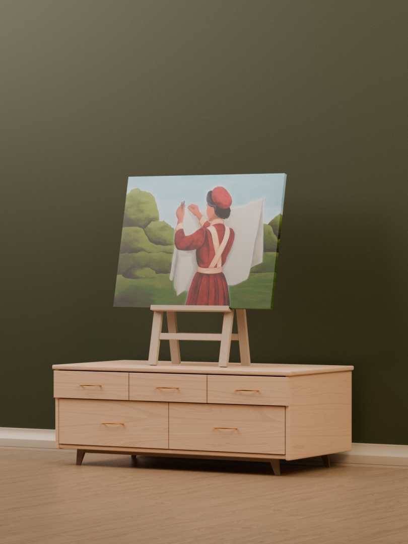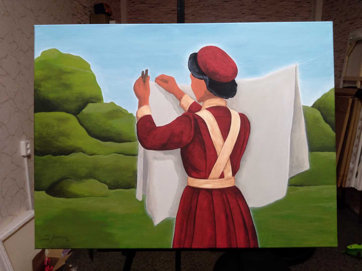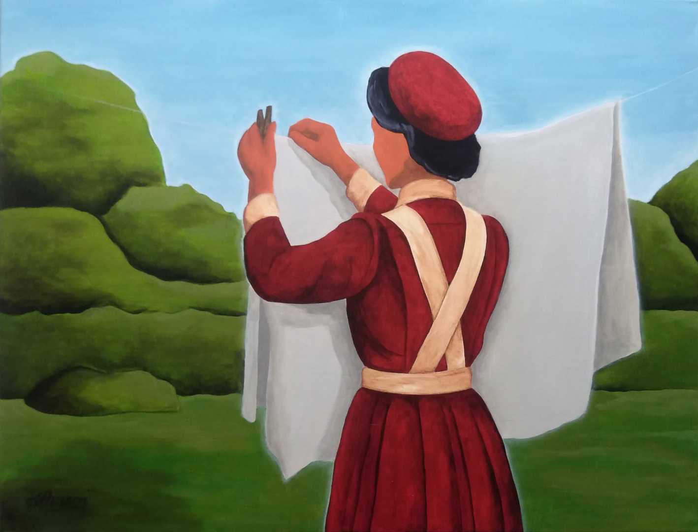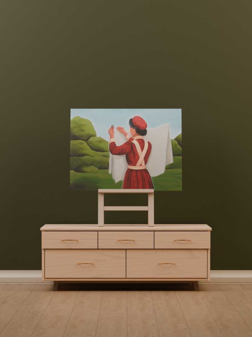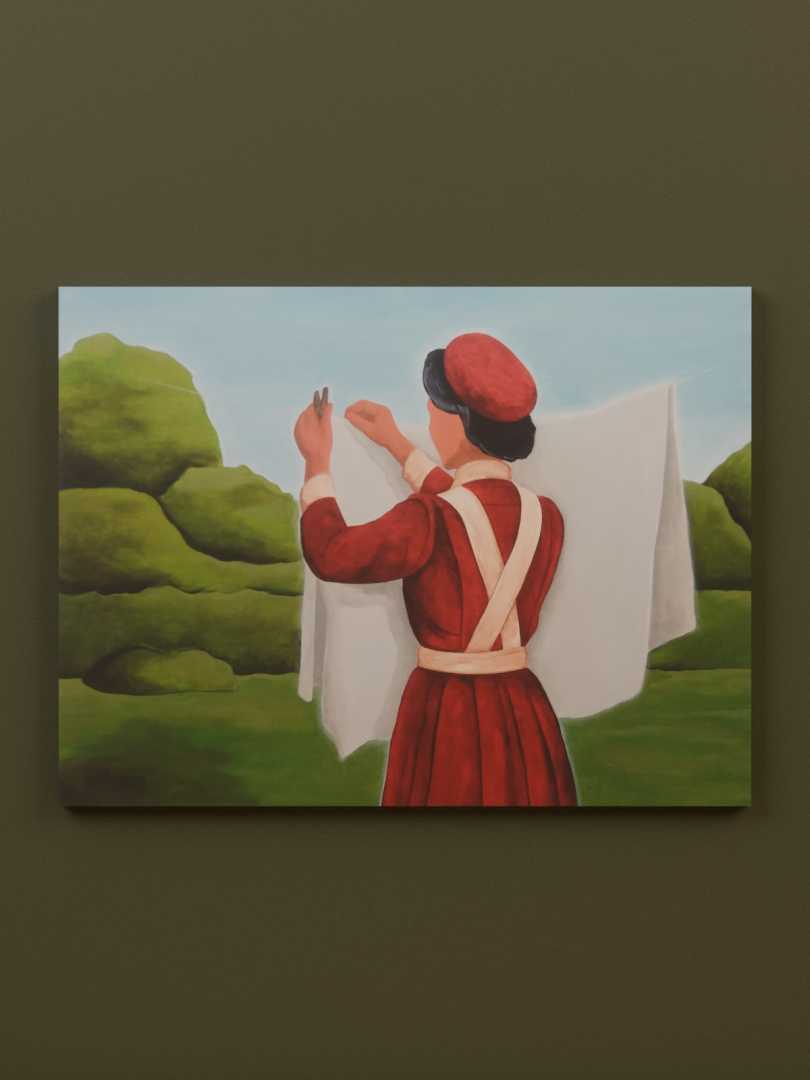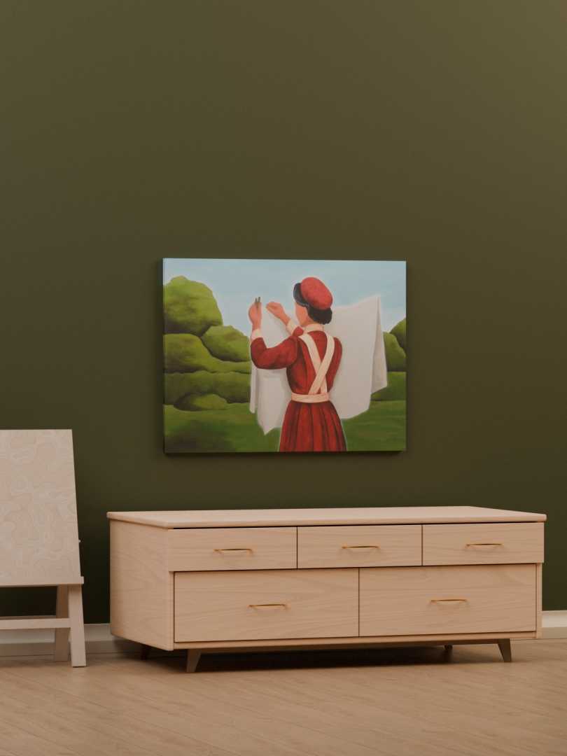 Женщина в тёмно-красном платье стоит спиной к зрителю и развешивает белую простыню на фоне зелёного пейзажа и ясного неба. Контраст насыщенного красного и чистого белого подчёркивает лаконичность композиции. Работа передаёт спокойствие, тишину и поэтику повседневного сельского быта.