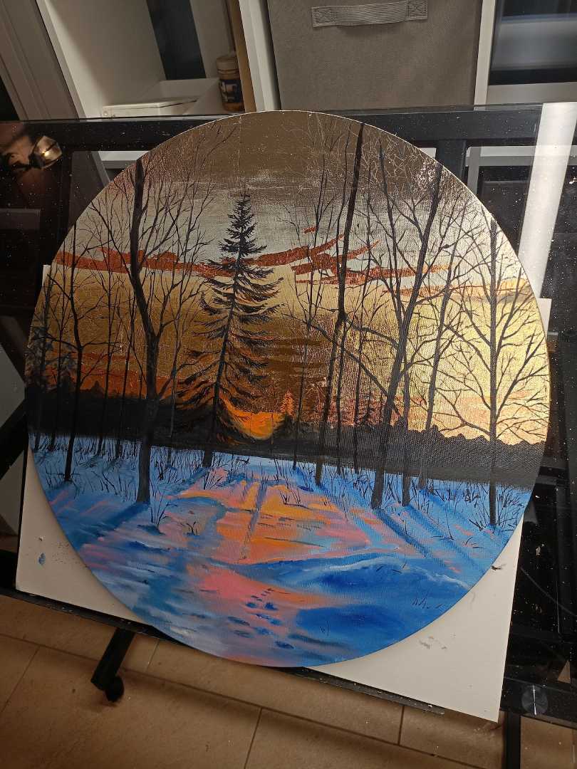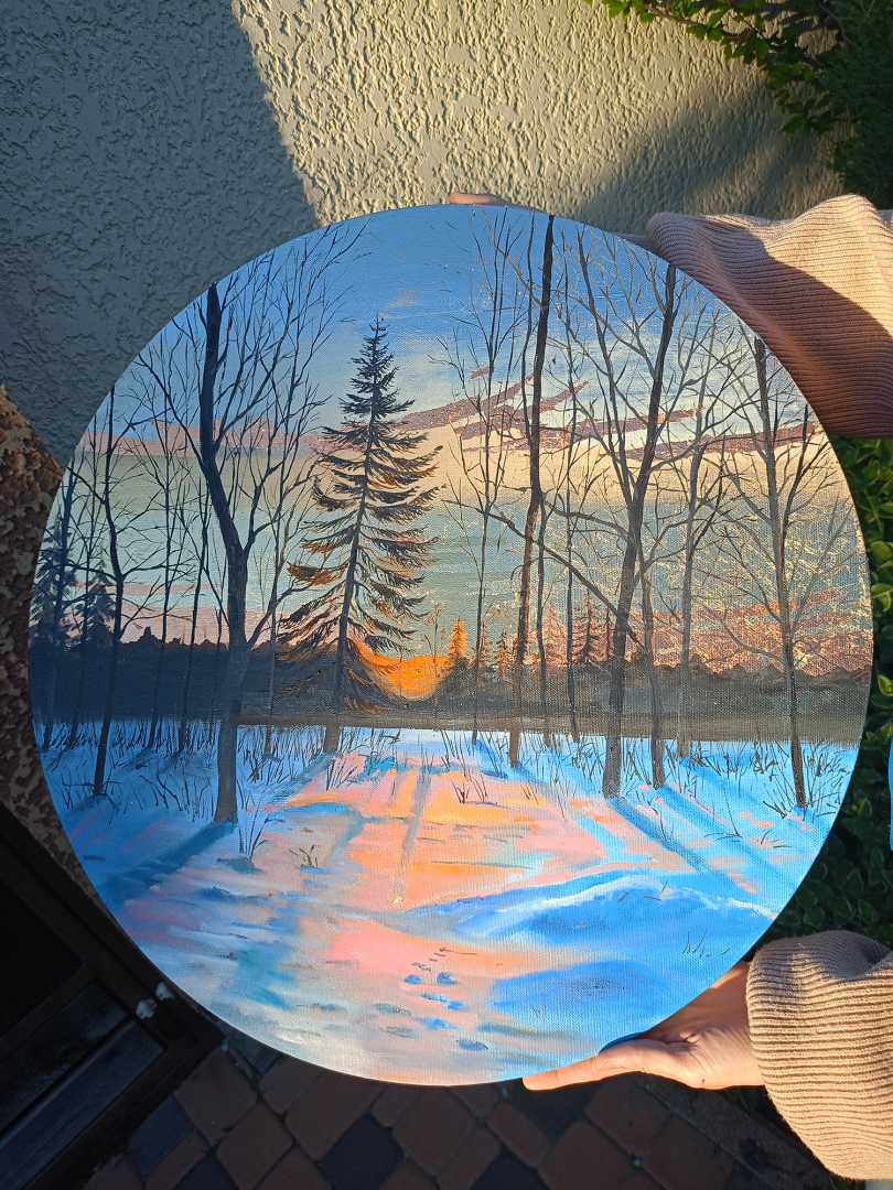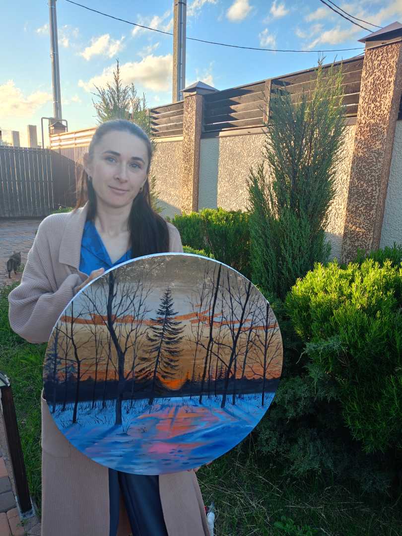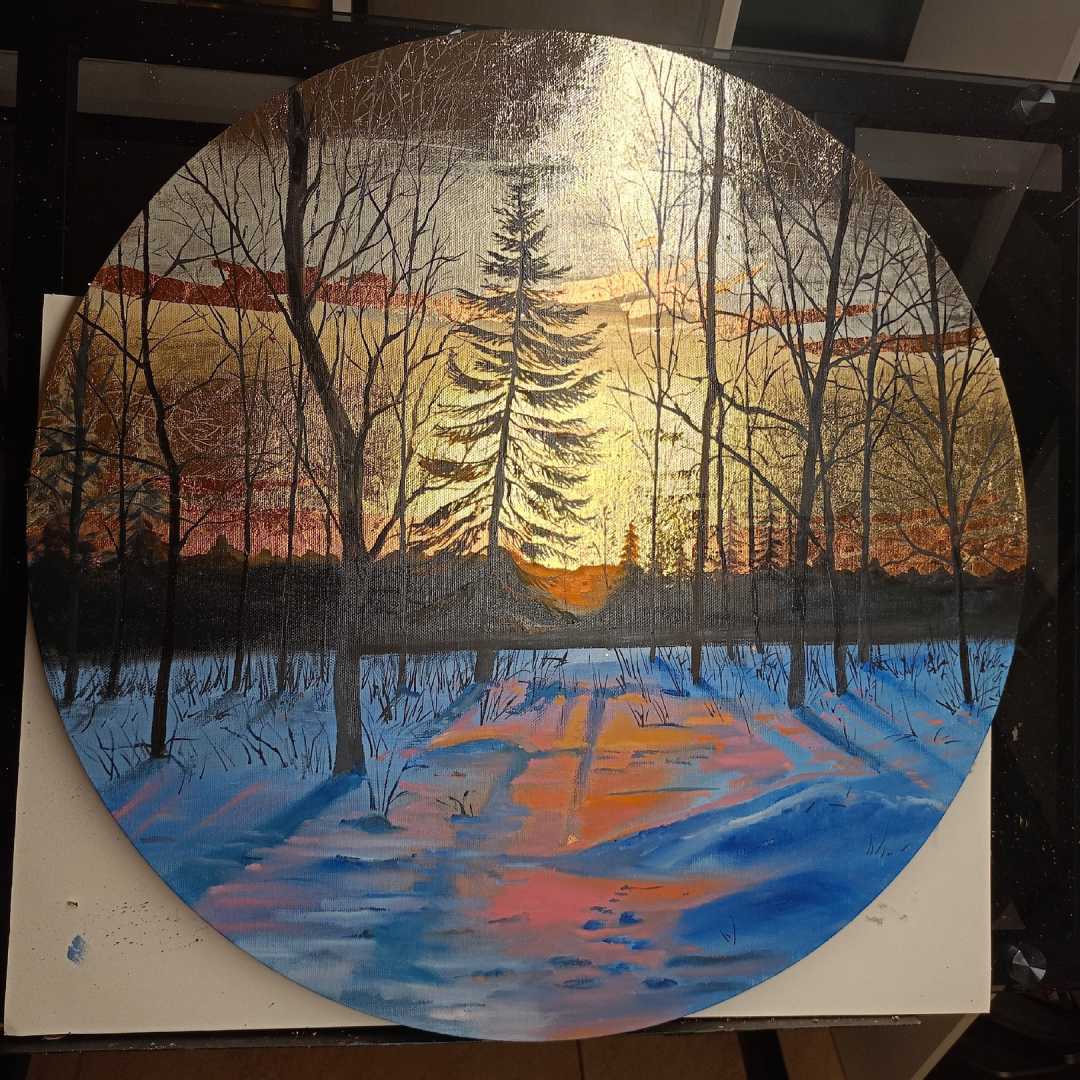 Пейзаж «Прощание солнца» 60х60 см. выполнен на круглом холсте с использованием масла и потали, защищенной лаком. Поталь создает интересные световые эффекты, картина приобретает динамику, глубину и изменчивость, что выгодно отличает ее от других произведений, выполненных при помощи обычных технологи