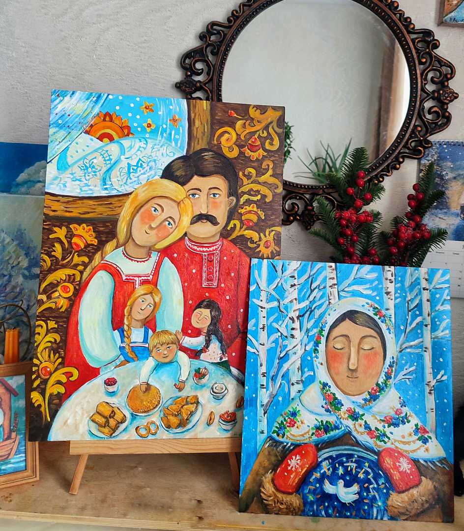 Картина «Прощёное воскресенье» — тёплая семейная сцена, вдохновлённая народной традицией и духовным смыслом праздника. За общим столом собирается семья, объединённая атмосферой любви, принятия и прощения. Орнаментальный фон, наивно-символическая манера письма и насыщенная цветовая палитра создают ощ