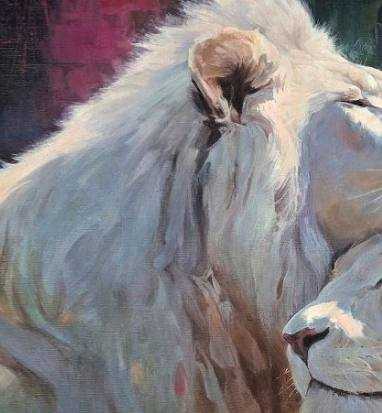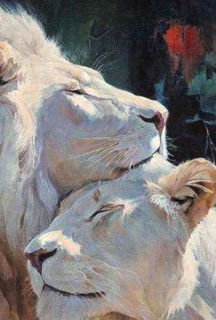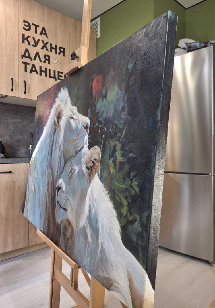 Эта выразительная картина показывает влюблённых львов — символ силы, гордости и преданности. Их нежное прикосновение и тёплое выражение глаз создают атмосферу глубокой любви и гармонии, воплощая идею настоящей связи и взаимного уважения. Работа вы