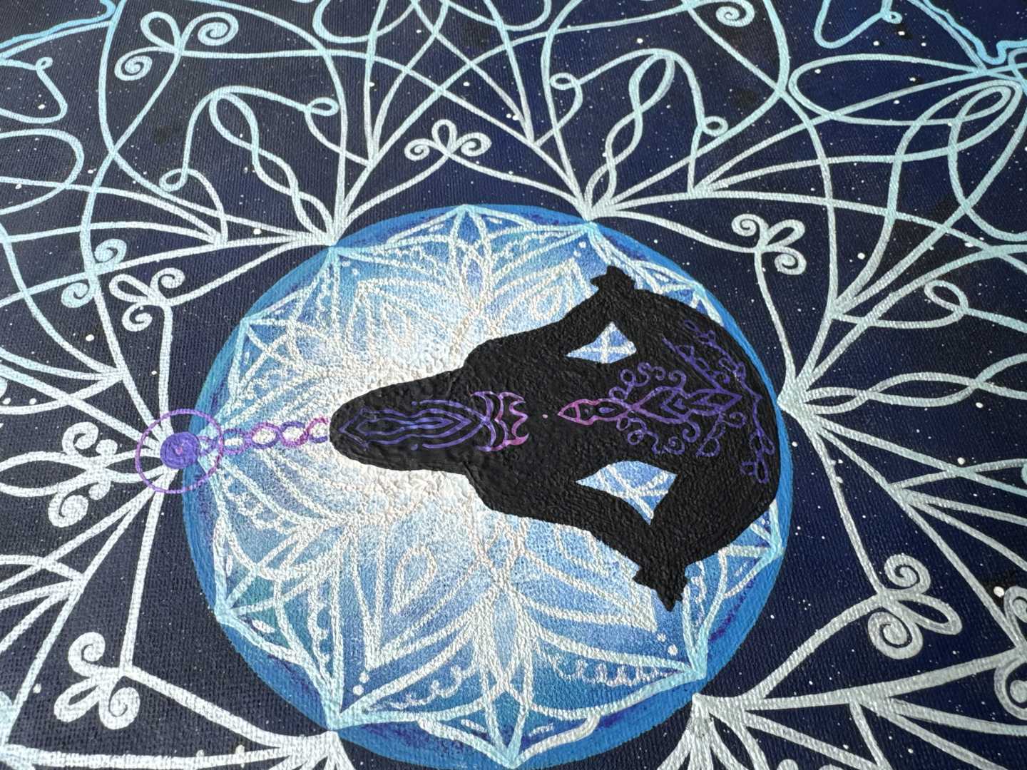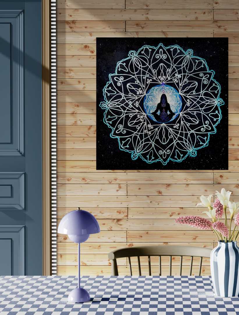 Эта работа идеально подходит для коллекционеров духовного искусства, космических мандал, декора сакральной геометрии и искусства, вдохновленного медитацией, привнося мир, глубину и сияющую символику в любое пространство — будь то студия йоги, комната исцеления, уголок для медитации или современный интерьер. Его неземное сияние и содержательные образы делают его мощным центром для практики осознанности, достижения внутреннего покоя и духовного роста.
