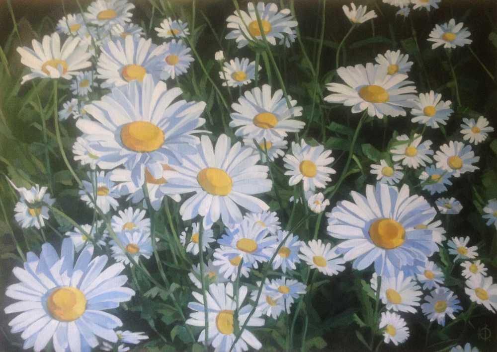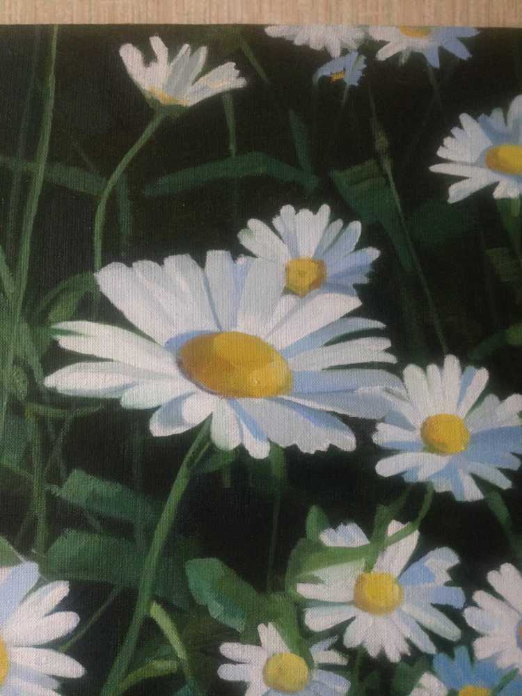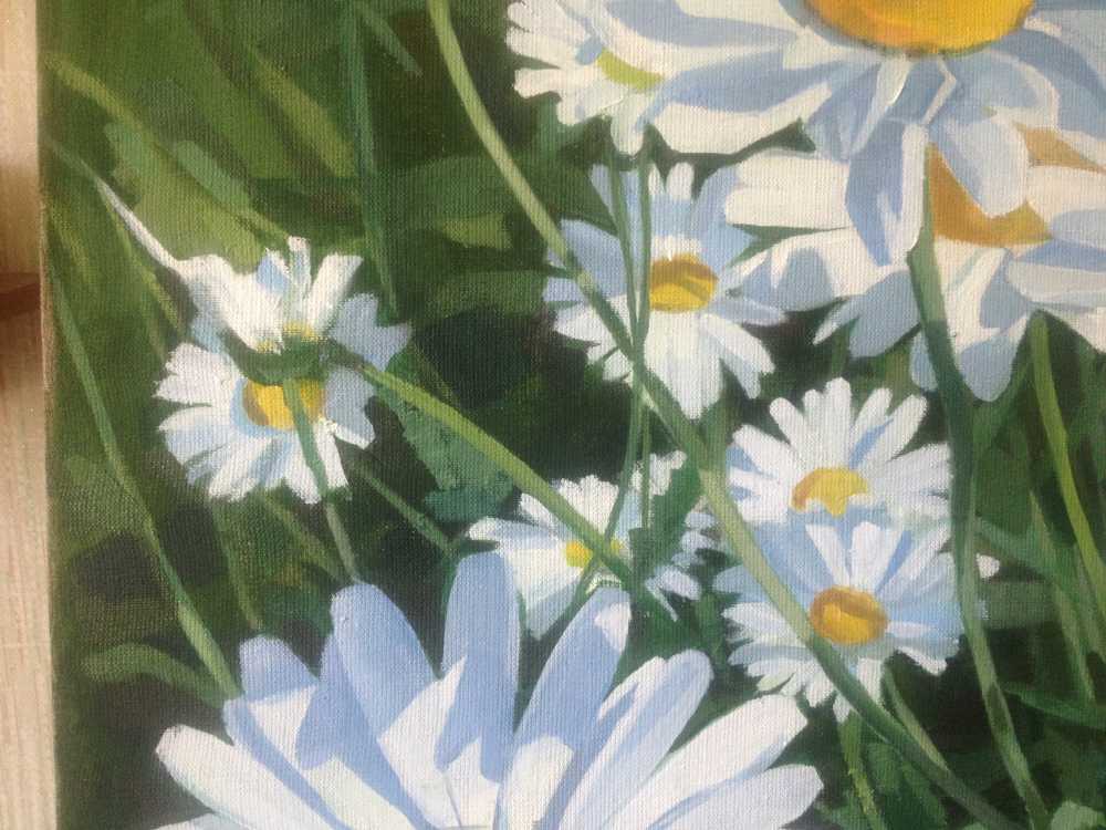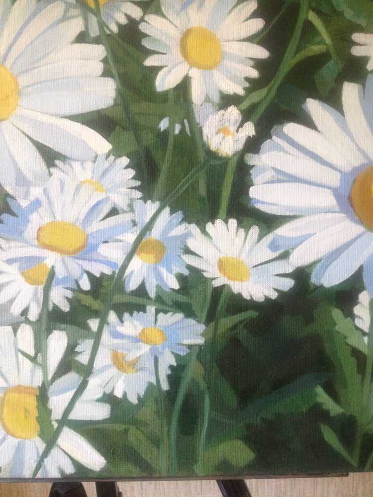 Поляна цветов ромашек. Картина на холсте маслянными красками. Основные цвета: зелёный, белый, жёлтый.
