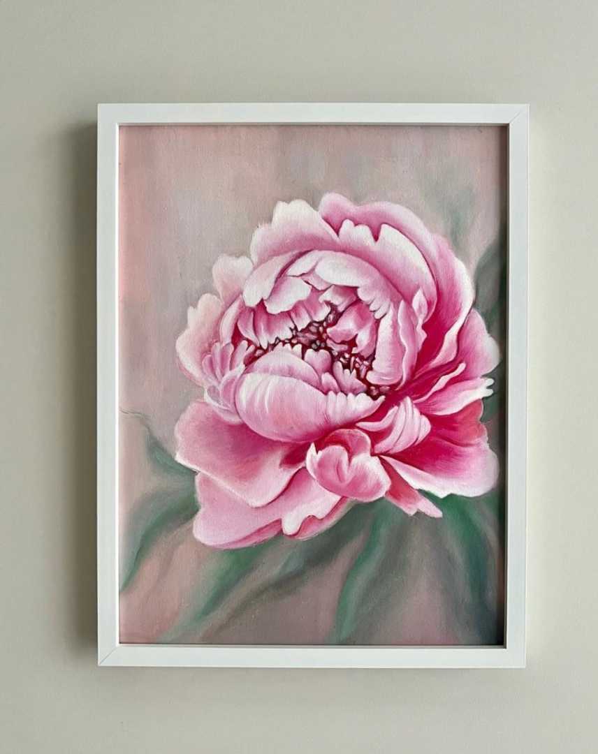 Данная работа представляет собой мощный акцент на главном герое — большом розовом пионе 🌹 в фазе его максимальной красоты. Художник фокусирует всё внимание на идеальной форме и сложной структуре цветка. Благодаря технике импасто (густого наложения краски) достигается потрясающий эффект объ