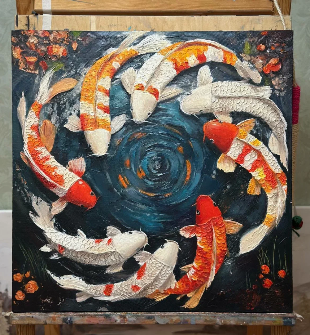 Каждая рыба словно рассказывает свою историю, а их движение по кругу — символ единства и бесконечности. Текстурная паста добавляет объёма и особой выразительности, усиливая эмоции, которые я вложила в работу —