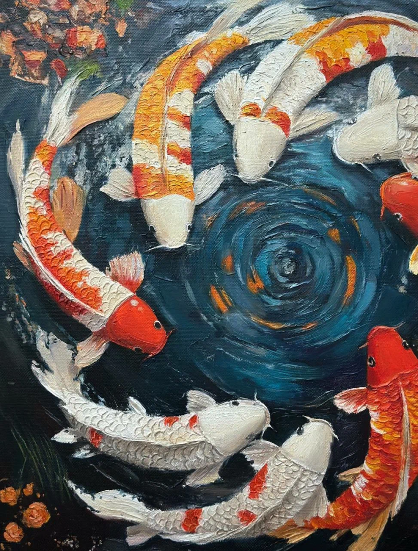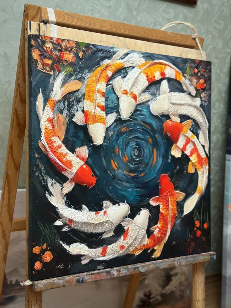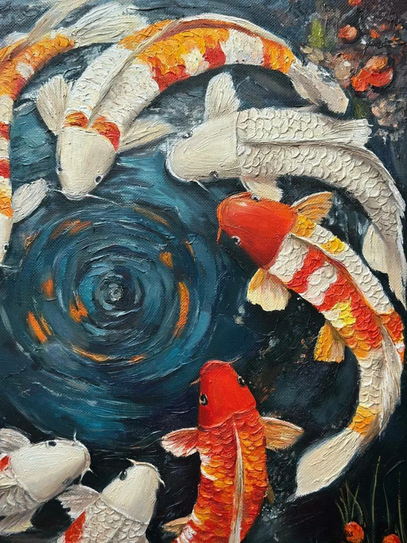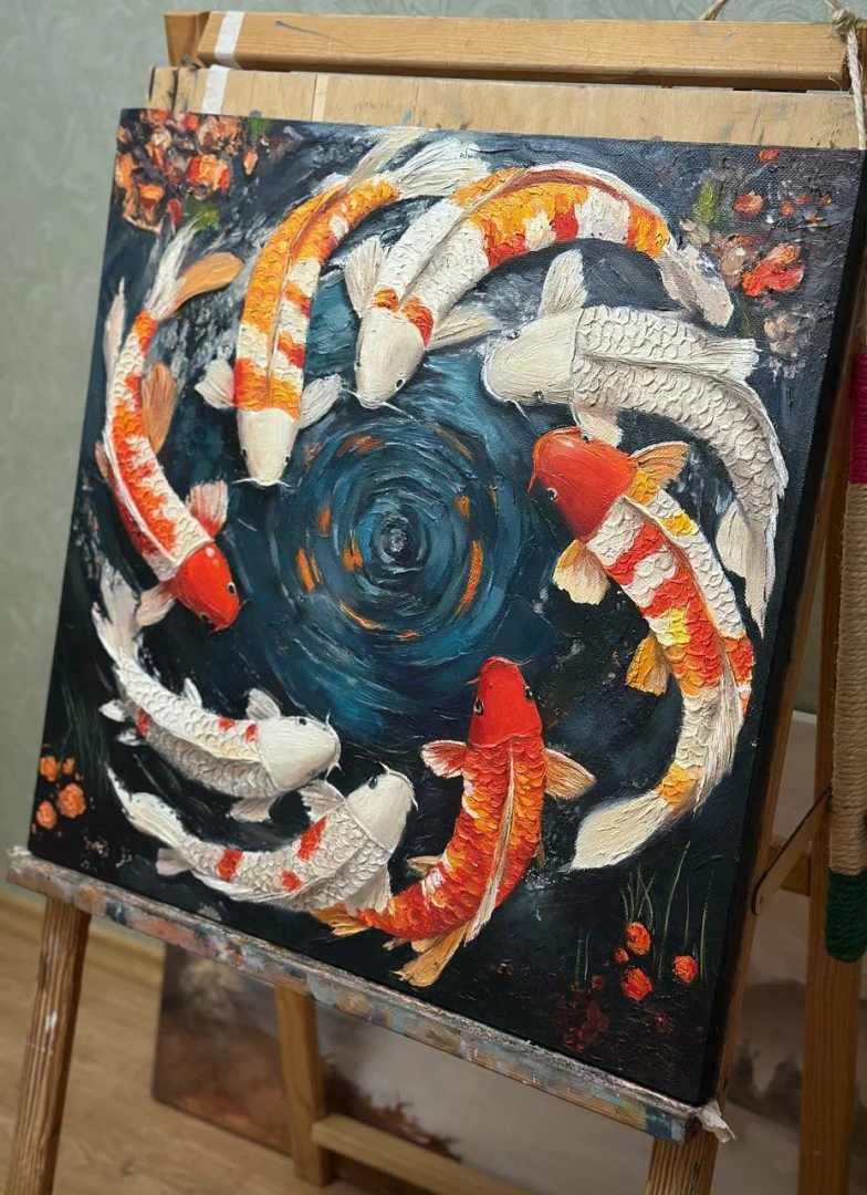 Эксклюзивная картина маслом текстурной пастой Рыбы Круг жизни кои