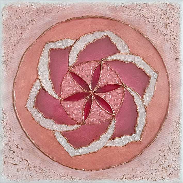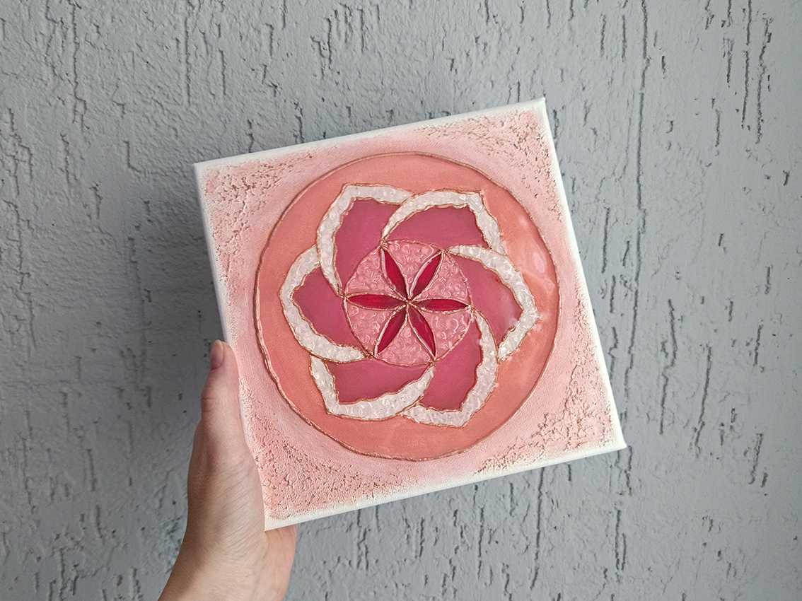 На картине изображен древний символ сакральной геометрии – «Семя жизни». Он встречается в культурах по всему миру и служит напоминанием о связи всего сущего и бесконечном потенциале для роста и развития. Плавные линии и цветовая палитра в оттенках розового создают атмосферу мягкости и тепла. Картина