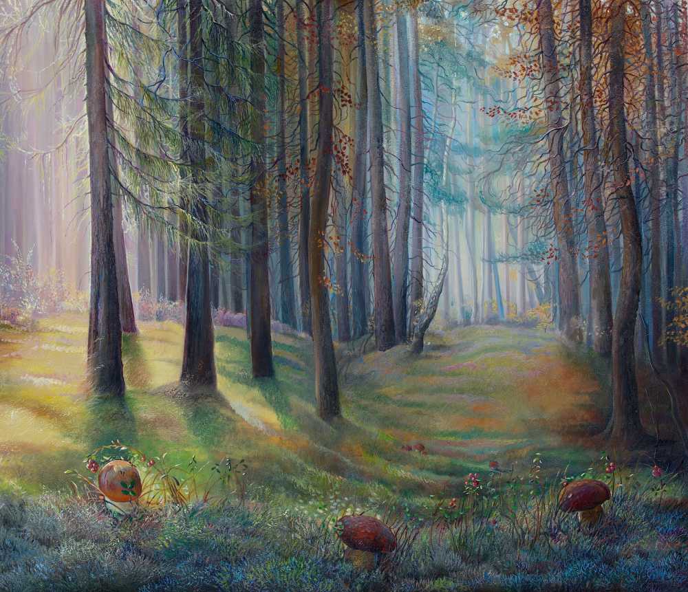 Картина «Сентябрьский лес» — светлый осенний пейзаж, наполненный мягким солнечным светом. Лучи пробиваются сквозь высокие стволы деревьев, создавая игру теней и ощущение глубины пространства.