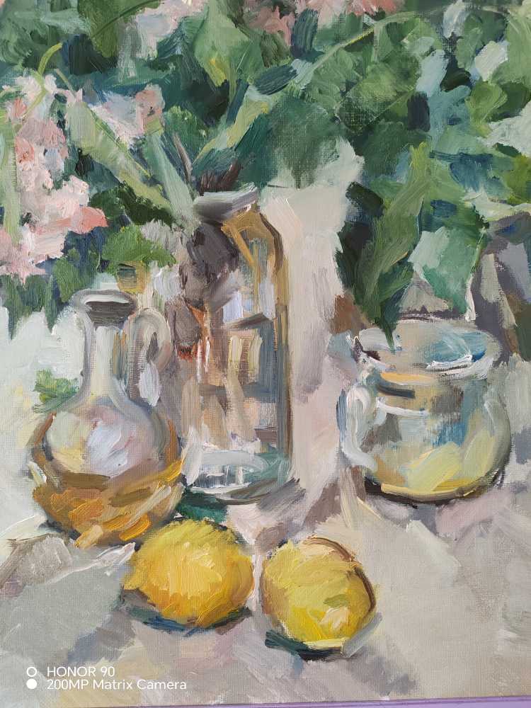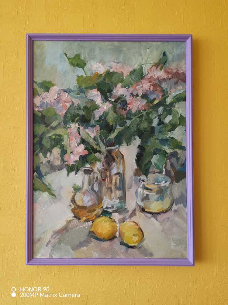 Картина «Сирень» — светлый цветочный натюрморт, выполненный маслом. Пышные ветви сирени сочетаются с прозрачной стеклянной посудой и яркими лимонами, создавая ощущение свежести, весны и естественной гармонии. Живописная манера, свободный мазок и мягкая палитра делают работу уютным и живым акцентом д