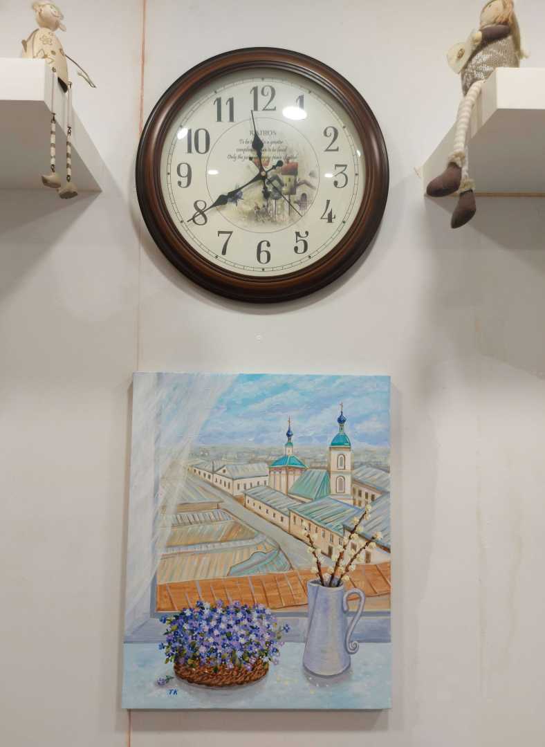Картина акрилом на холсте. Изображен вид из окна на город Москва. На окне натюрморт с первоцветами.