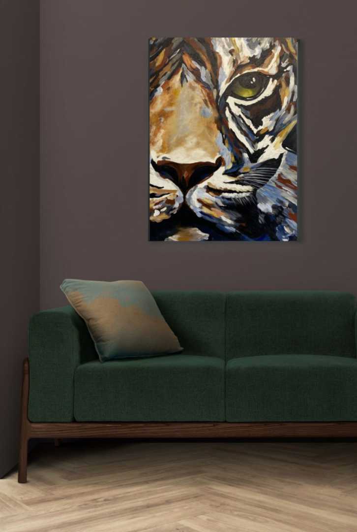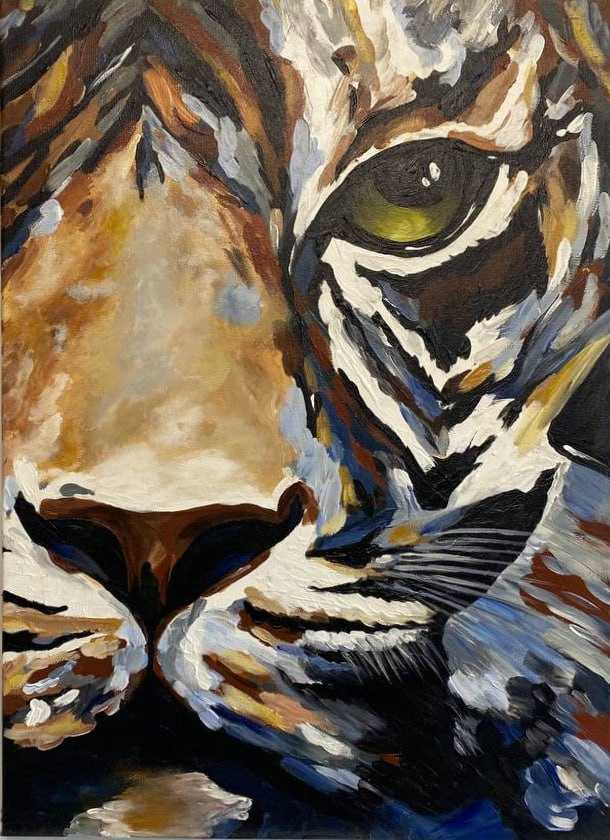 Крупный план глаза тигра — не как изображение, а как объединение энергии из мазков. Акрил нанесён густо, пастозно: линии шерсти, контрастные полосы, зелёный глаз — всё построено на свободных, у