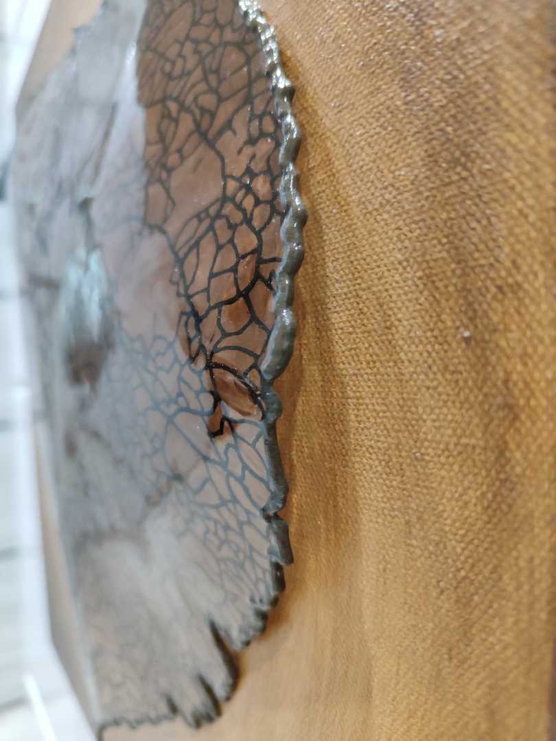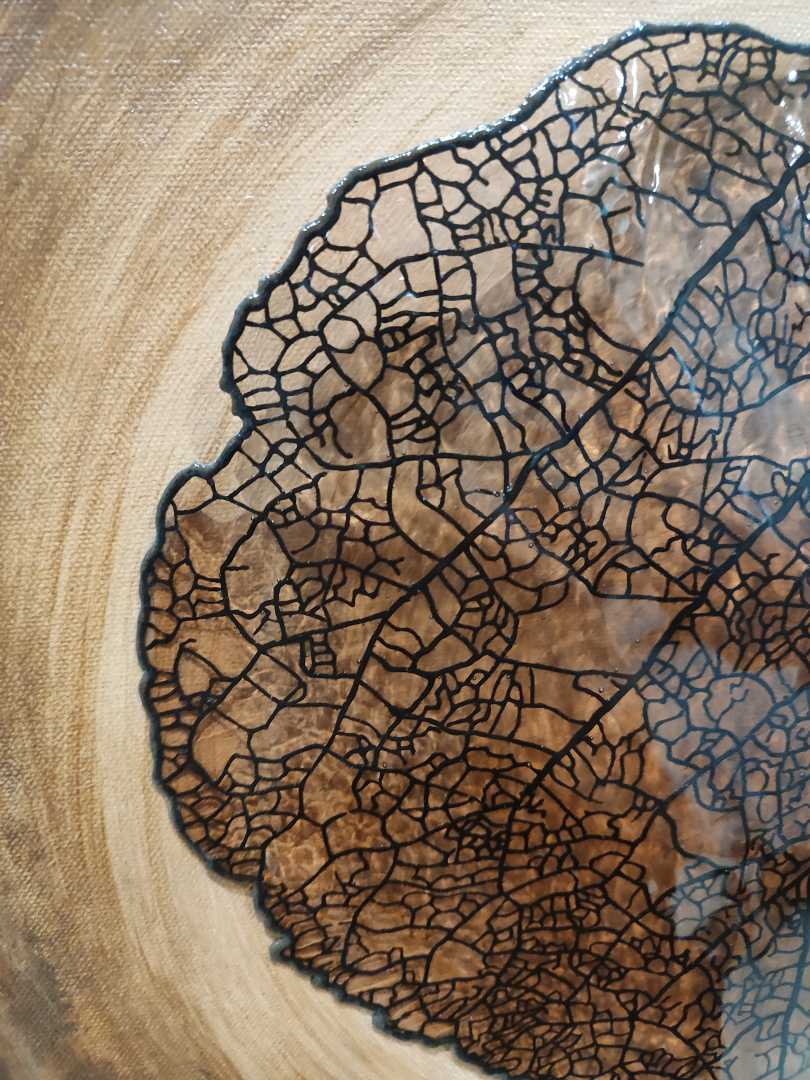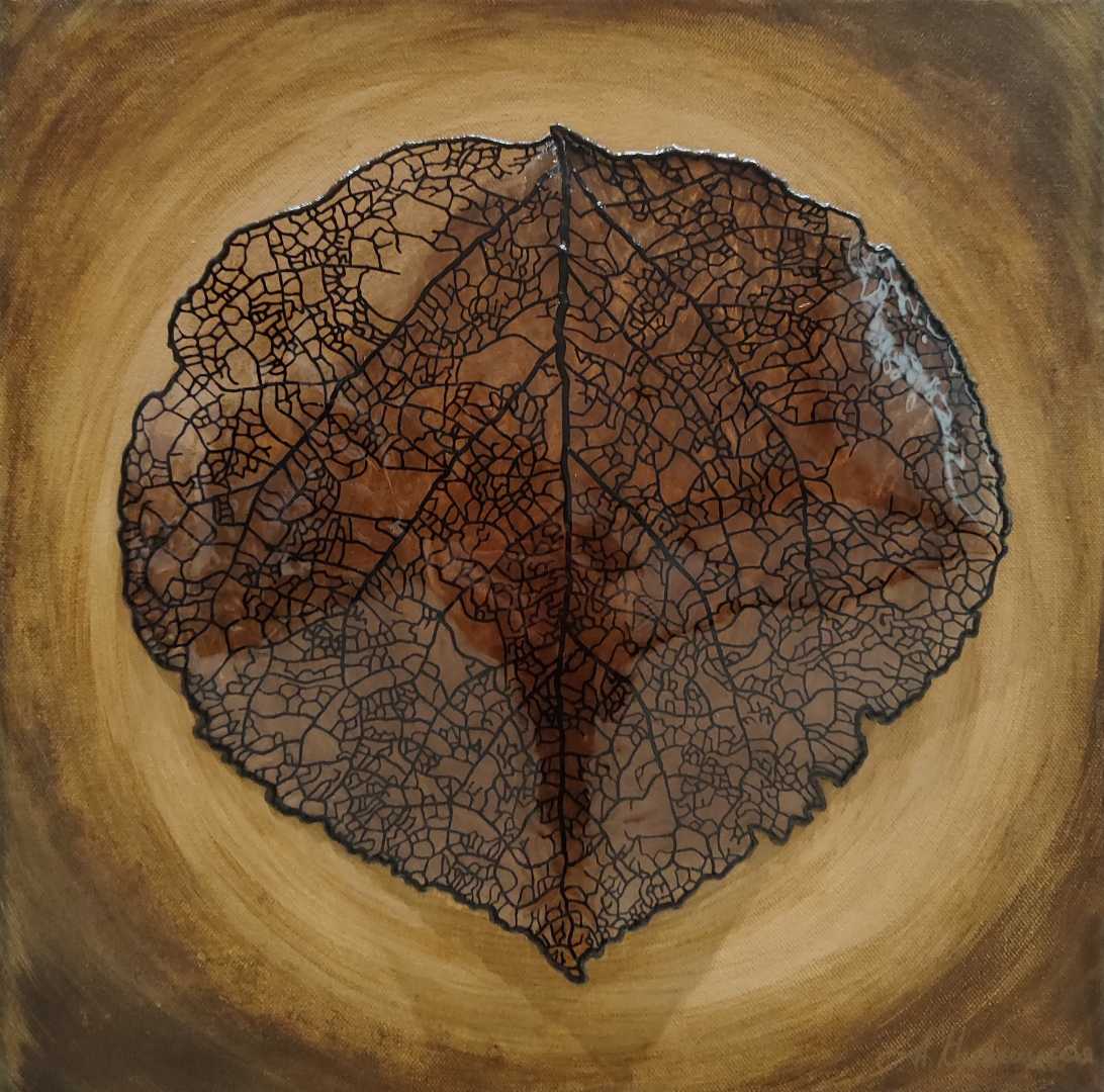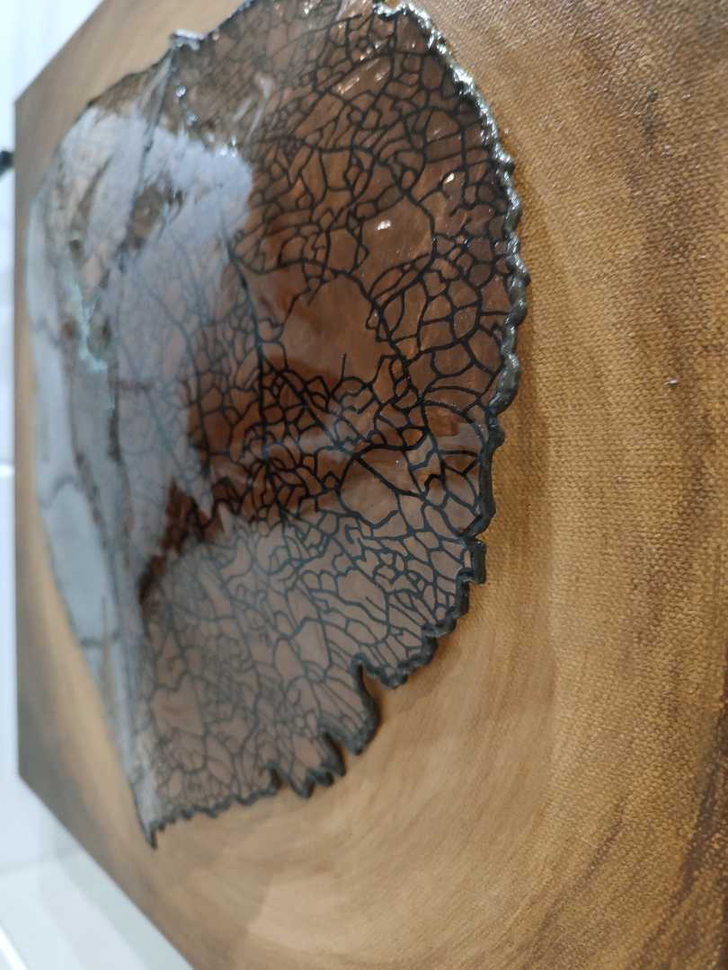 В этой работе автор использует скелетированный лист как емкую визуальную метафору судьбы — тонкую, переплетённую сеть, которая одновременно уязвима и неизбежна. Прожилки выполнены вручную текстурной пастой, а затем залиты эпоксидной смолой, создающей глянцевые, прозрачные и полупрозрачные участки, к