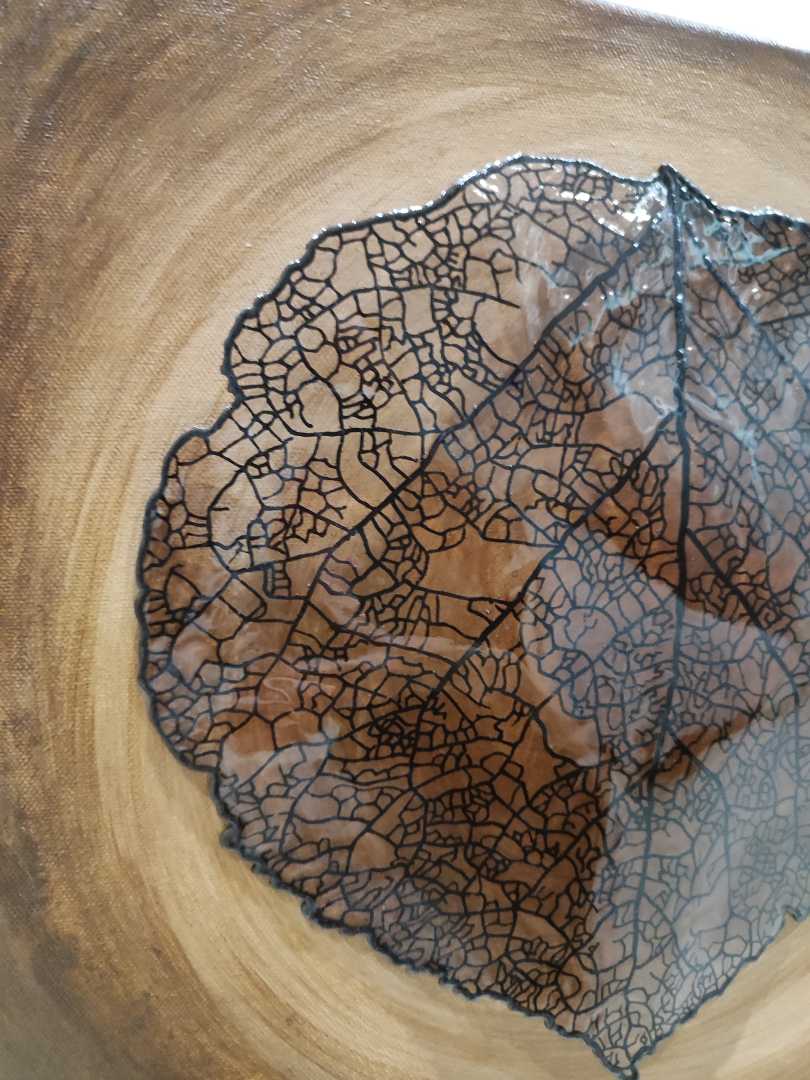 Фон выполнен акриловыми красками с градацией тёплых коричневых тонов. Торцы холста окрашены в согласованные цвета, что делает картину аккуратной со всех ракурсов. Тёплая земляная палитра и концентрическая подсветка фона создают ощущение круга времени — от рождения к угасанию и обратно — а мягкие переходы света и тени подчеркивают хрупкость и одновременно настойчивость формы. Там, где плоть листа исчезла, остаётся рисунок событий и выборов, линии, по которым течёт жизнь. Работа балансирует между нажатием времени и вечностью образа: смерть и возрождение, утрата и память, случайность и закономерность превращаются в единый визуальный язык.