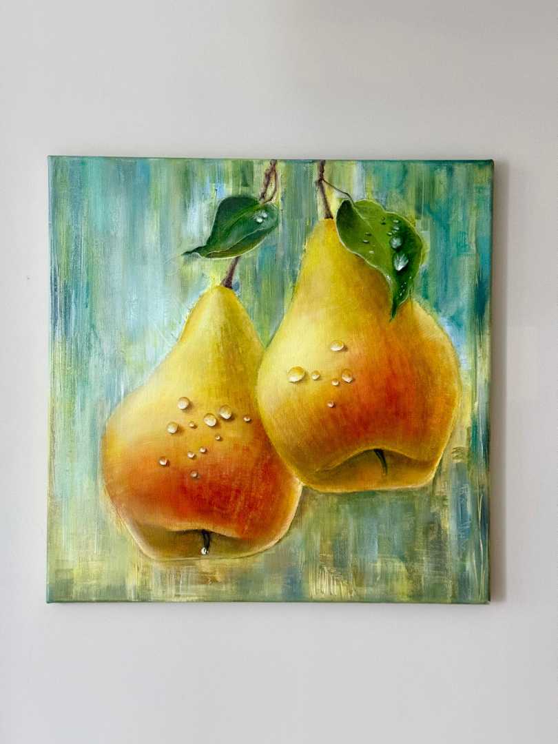 На холсте застыл миг чистой, прохладной гармонии. Две спелые груши 🍐, тяжелые и налитые солнцем, будто излучают изнутри мягкое золотисто-медовое сияние. Их бархатистая кожица, испещрённая веснушками, ещё хранит прохладу недавнего летнего ливня. Но главные героини этой картины — сияющие капли
