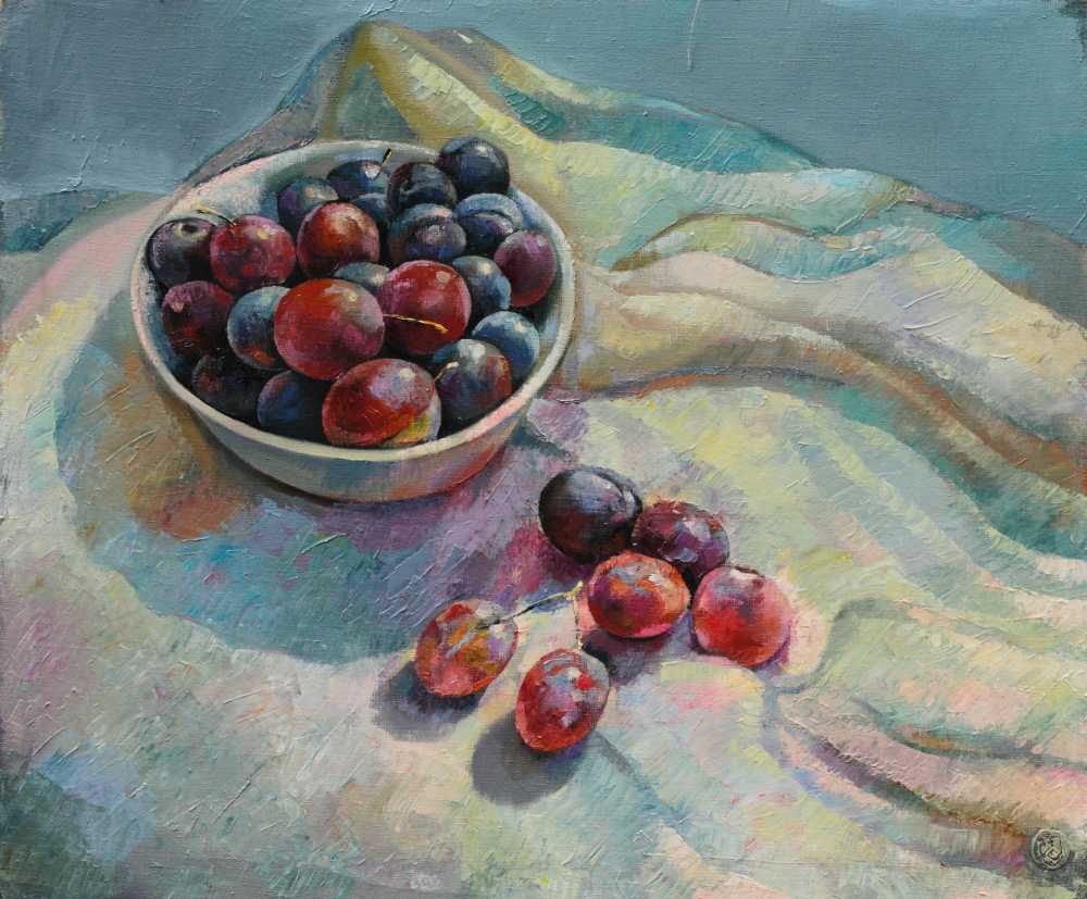 Сочный и выразительный натюрморт со сливами, написанный маслом в классической живописной манере. Глубокие бордовые и сине-фиолетовые оттенки фруктов гармонично сочетаются со светлой драпировкой, создавая атмосферу уюта и тепла.
