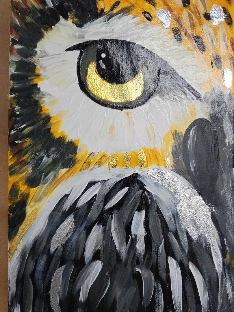 Вокруг глаза мастерски прорисованы перья: использованы контрастные оттенки — белый, чёрный, серый, а также вкрапления золотого и жёлтого, что создаёт динамичный и объёмный эффект. Белые мазки выглядят пушистыми и мягкими, чёрные — плотными и графичными, а серые служат переходным тоном, связывая композицию. Золотые акценты не только подчёркивают глаз, но и добавляют картине роскоши и загадочности.