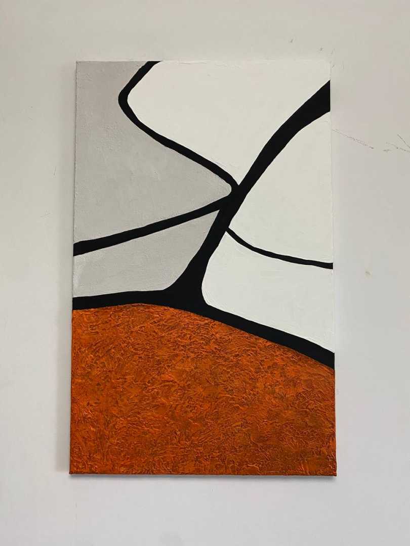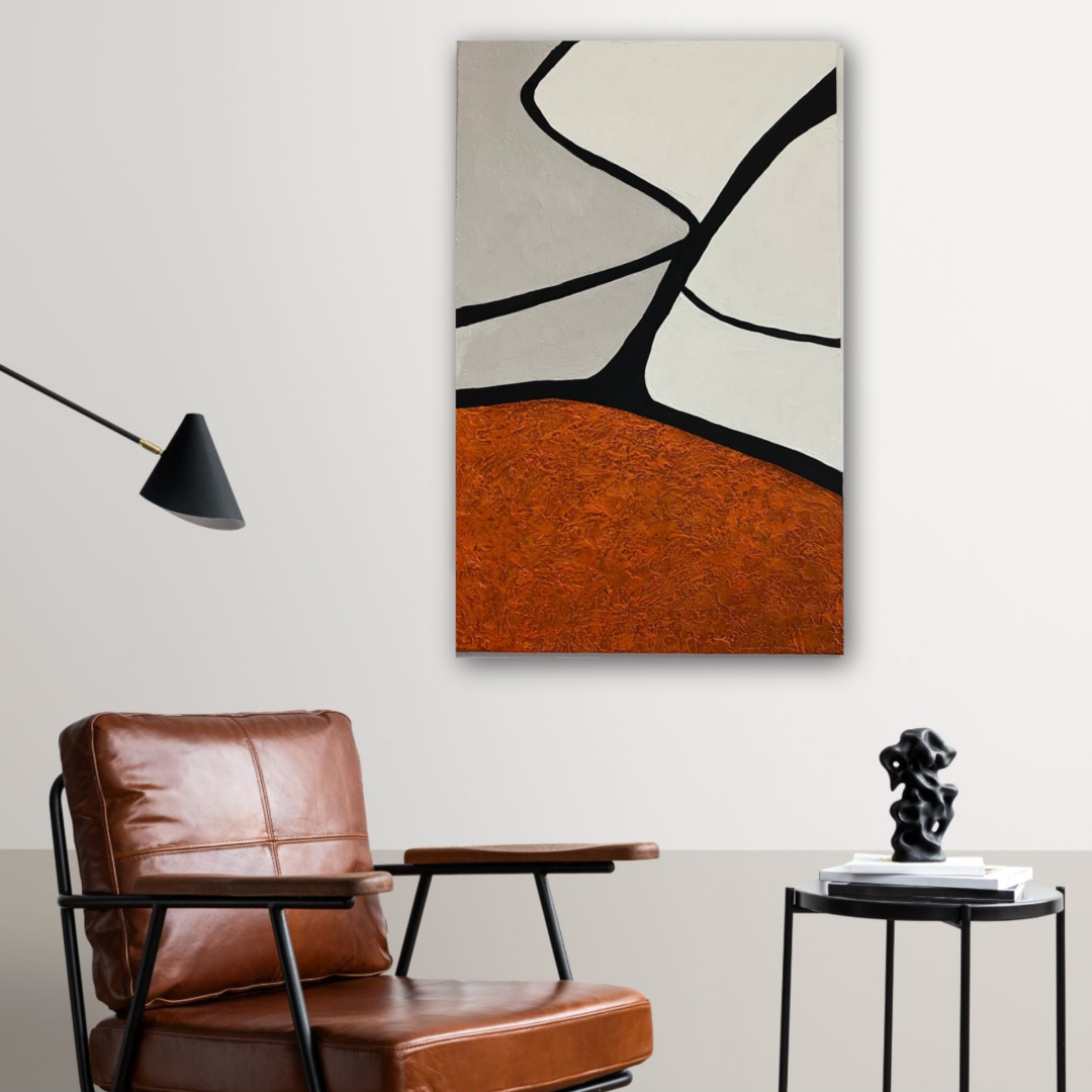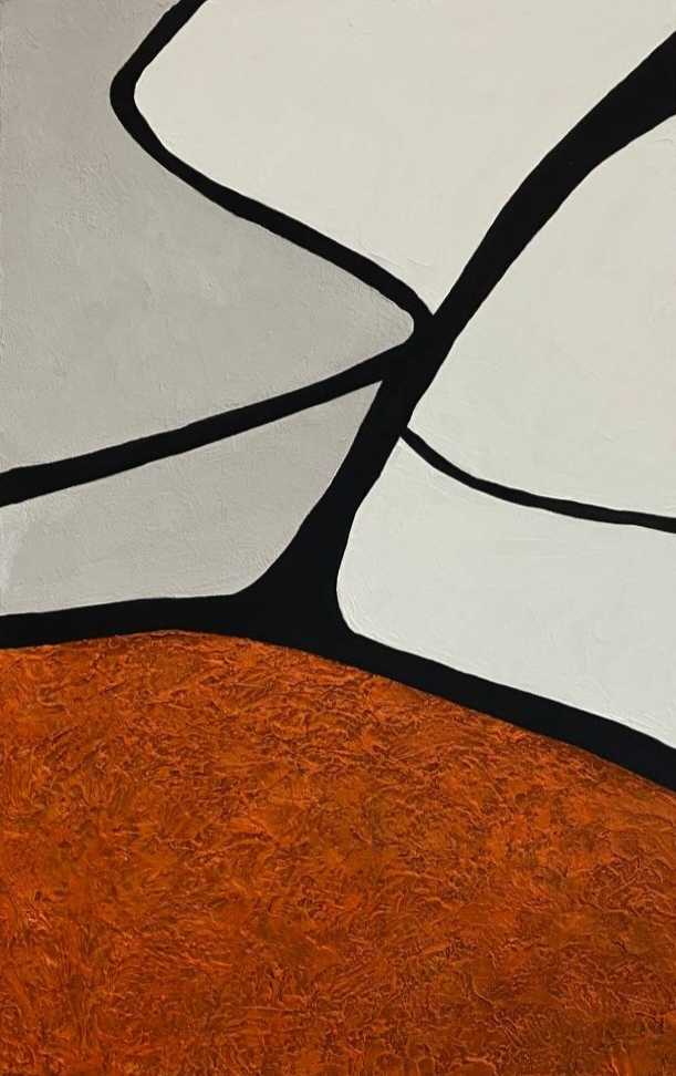 — матовые, спокойные, почти без рельефа. Нижняя часть — глубокий оранжево-коричневый фон с выраженной текстурой, будто земля, камень или высохшая краска — создаёт ощущение основания, опоры.