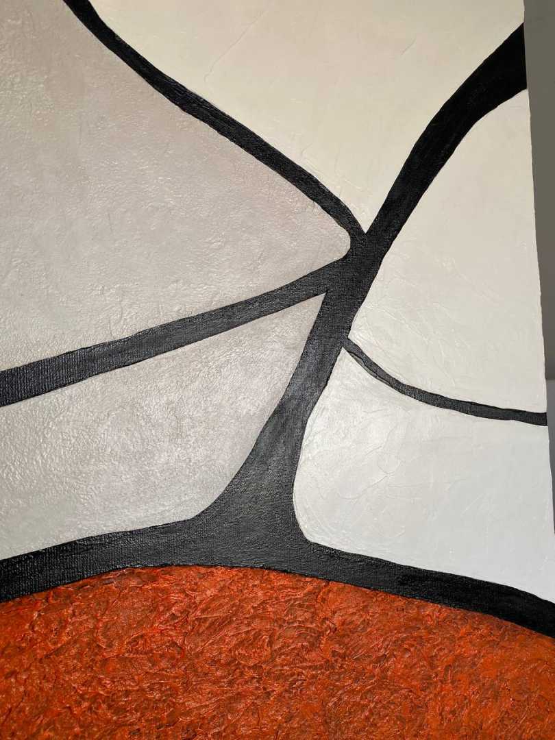 Абстрактная композиция, построенная на контрасте плоскости и объёма, гладкости и фактуры. Чёрные линии — чёткие, графичные, как каркас, делящий пространство на зоны покоя. Серые участки