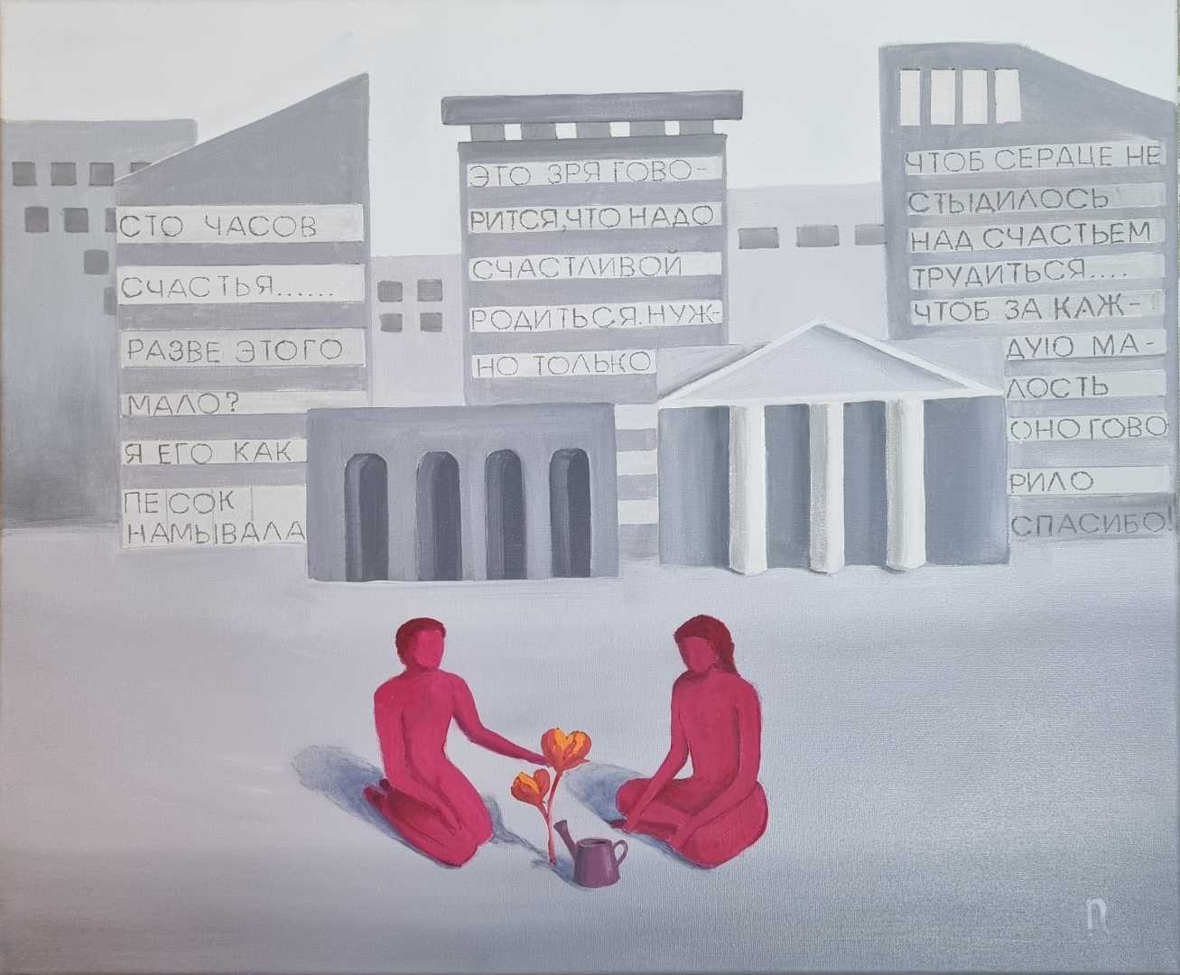 атного и важного процесса обмена счастьем с другими. Здесь художник исследует суть любви не как абстрактное понятие, а как живое, динамичное взаимодействие, требующее усилий, понимания и жертвенности. Картина вдохновлена стихотворением В.Тушновой "Сто часов счастья".