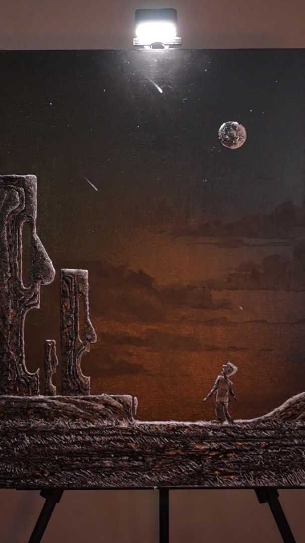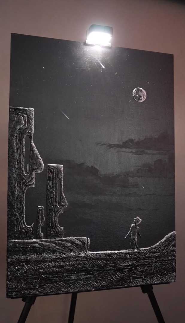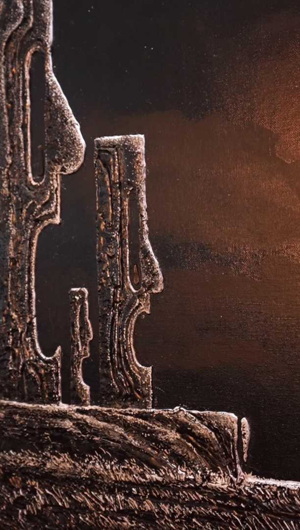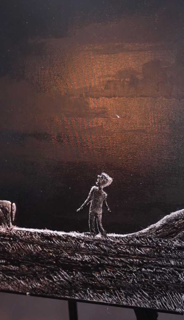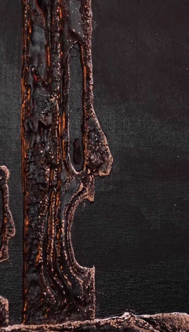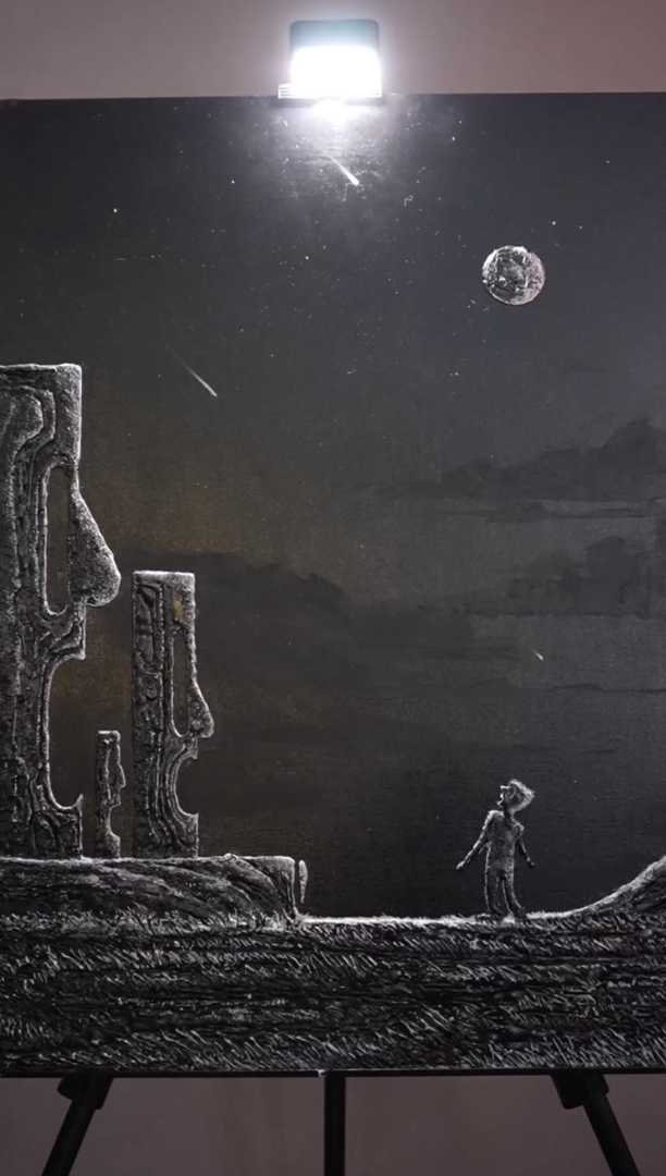 Эта картина мое образное представление и передача борьбы нашего я со страхами. Эта картина передает реалии отношения к страхам которые повседневно окружают нас. Они парализуют и вводят в ступор, не позволяют двигаться дальше. в этой борьбе мы перестаем чувствовать свое истинное Я. Это напоминание се