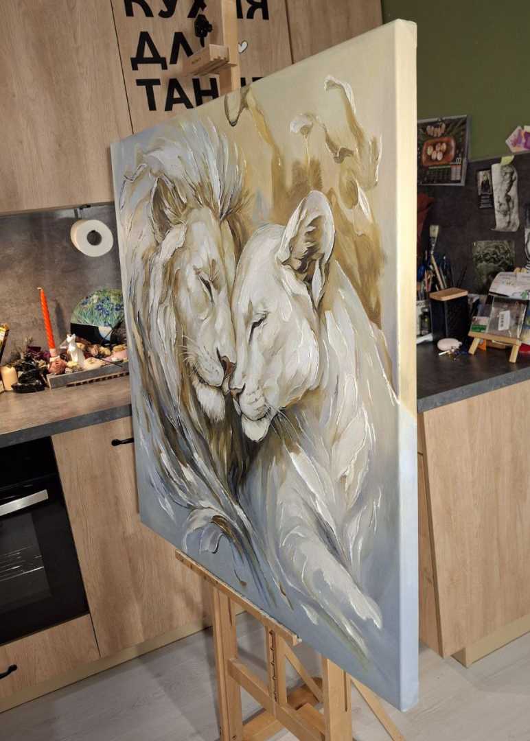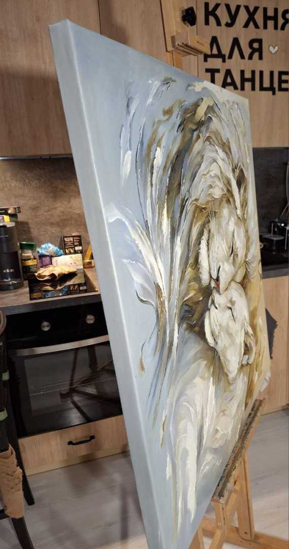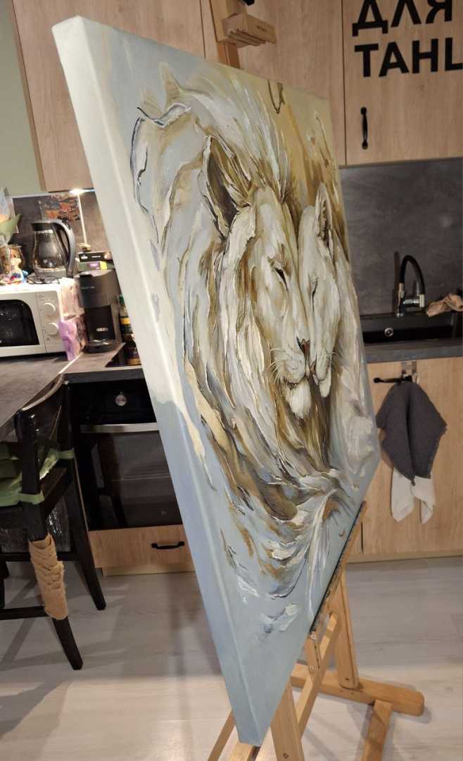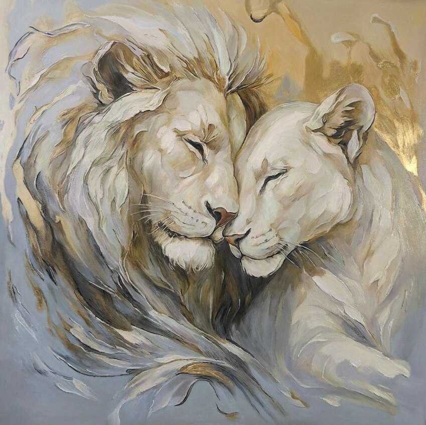 этих величественных животных. Для меня лев — это воплощение защиты, а львица — нежности и преданности. Я писала эту картину с мыслью о том, что дом — это место, где мы можем быть собой, где нас всегда примут и защитят. Надеюсь, эта работа принесет в ваш дом энергию гармонии и станет символом вашей нерушимой связи