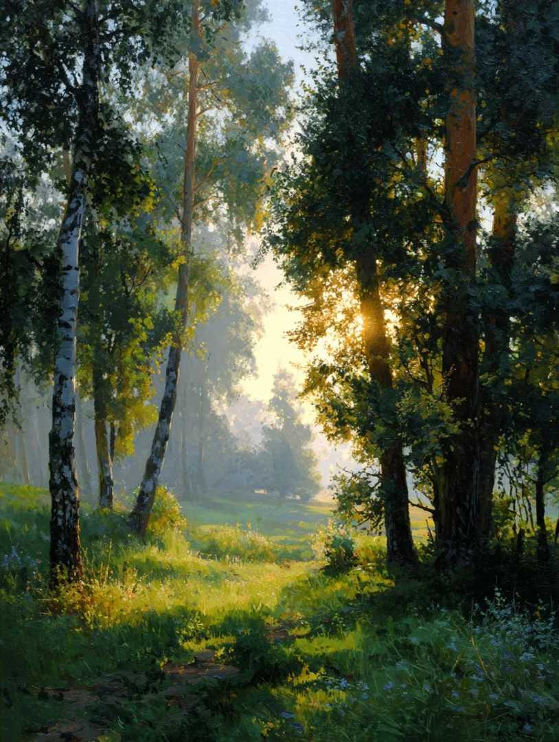 Погрузитесь в магию утреннего света на этой иллюстрации — лес с изящными берёзами, пробуждающийся под ласковыми лучами солнца. Работая над этой картиной, я чувствовала трепет и умиротворение, словно сама гуляла по тихой лесной тропе, ощущая свежесть воздуха и тепло первых солнечных лучей. Не хотелос