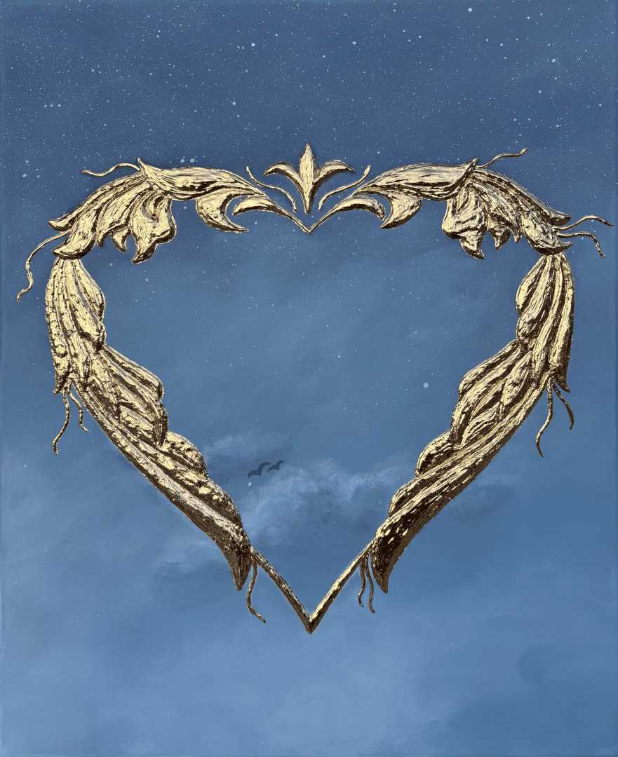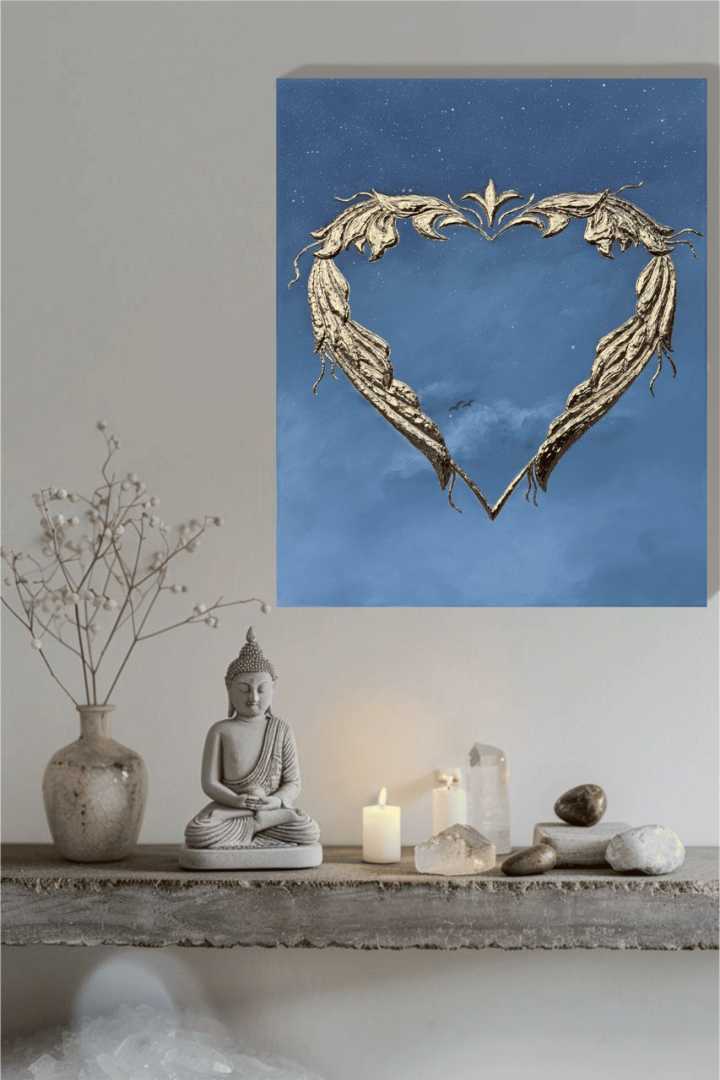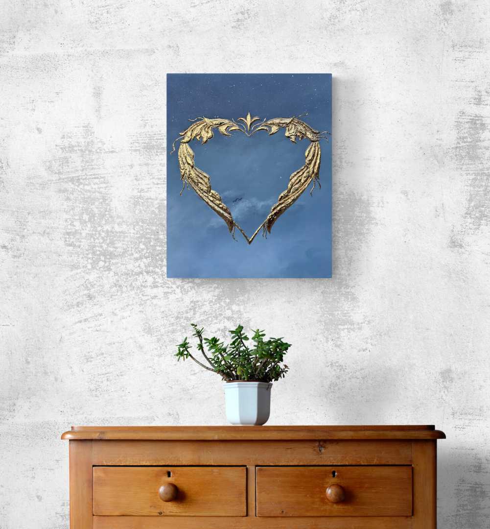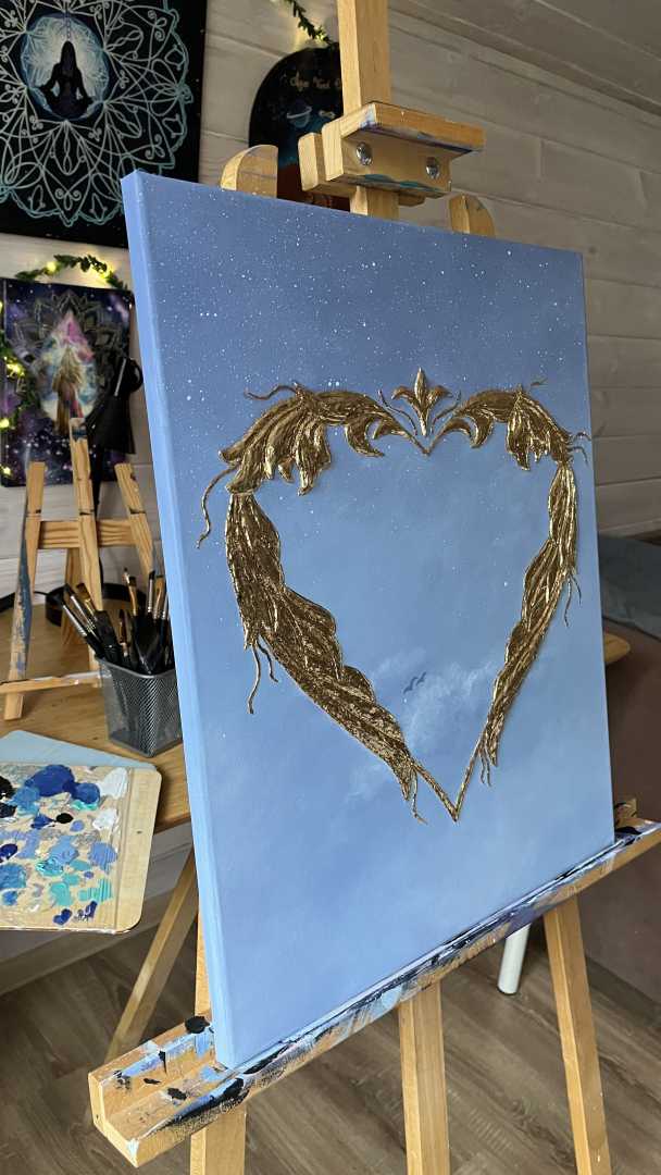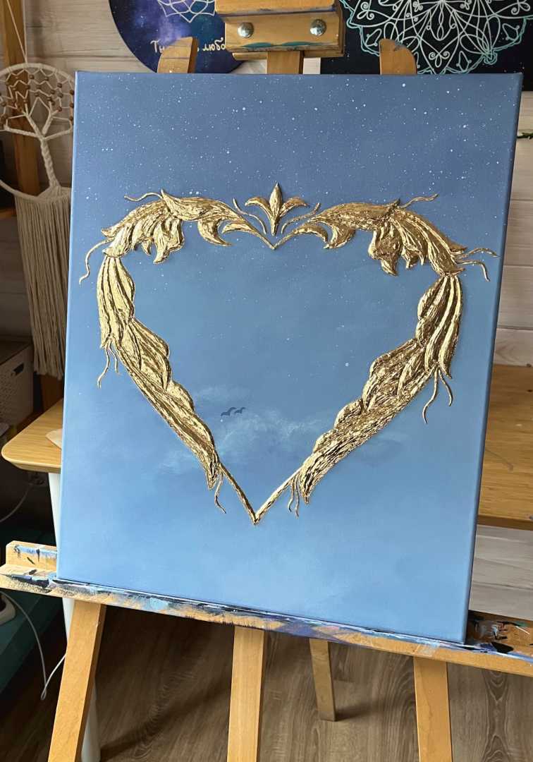Сердце выполнено из текстурной пасты с использованием золотистой потали, создающая сияющий акцент на фоне спокойного градиента от глубокого синего к мягким небесным оттенкам. Символические детали, лёгкие облака и маленькие силуэты птиц добавляют ощущение лёгкости, простора и внутреннего пространства, приглашая к тихому созерцанию.